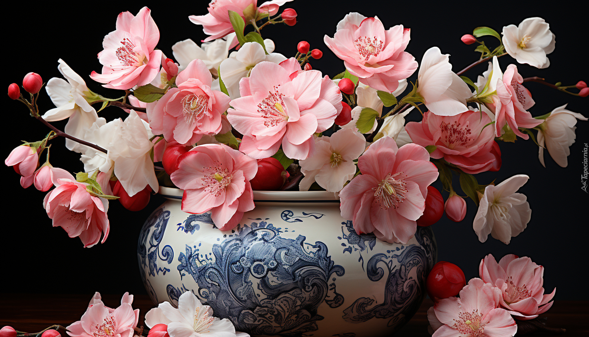 Edytor tapety: Kolorowe kwiatki w doniczce na czarnym tle
