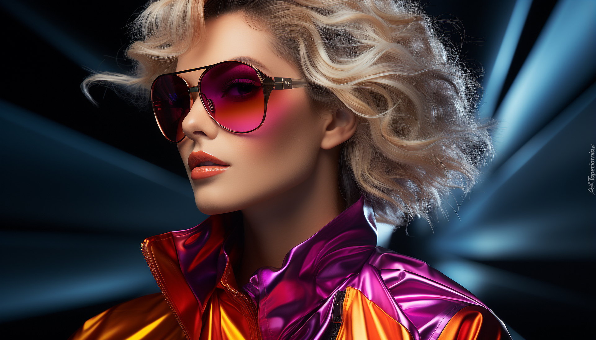 Edytor tapety: Blondynka w okularach słonecznych i kolorowej kurtce