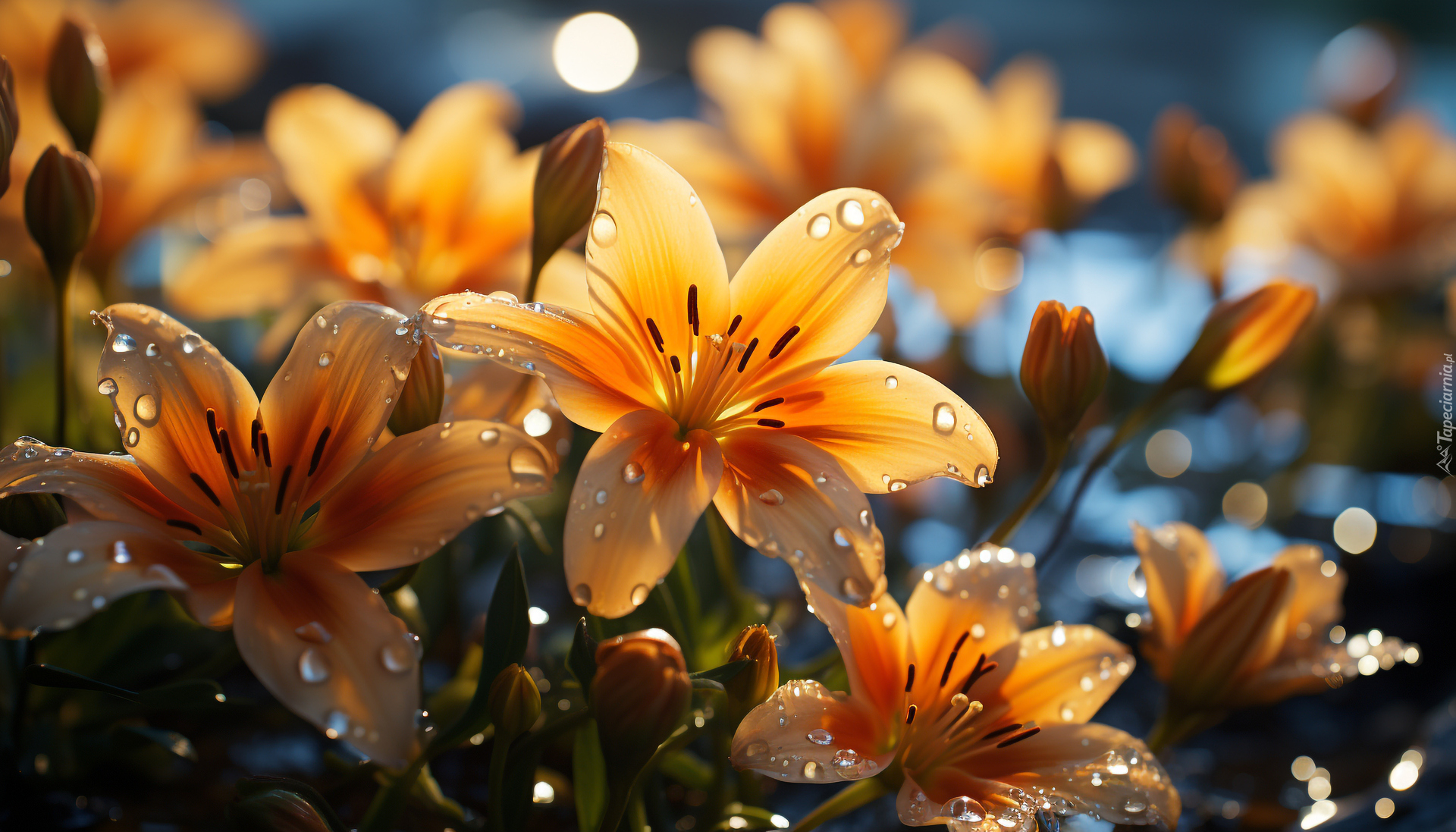 Edytor tapety: Krople wody na żółtych liliach