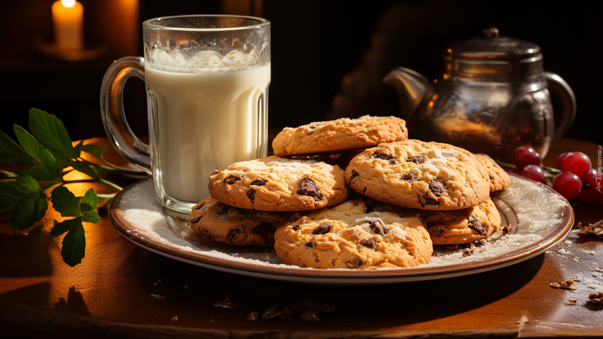 Edytor tapety: Kubek z mlekiem obok ciastek na talerzyku