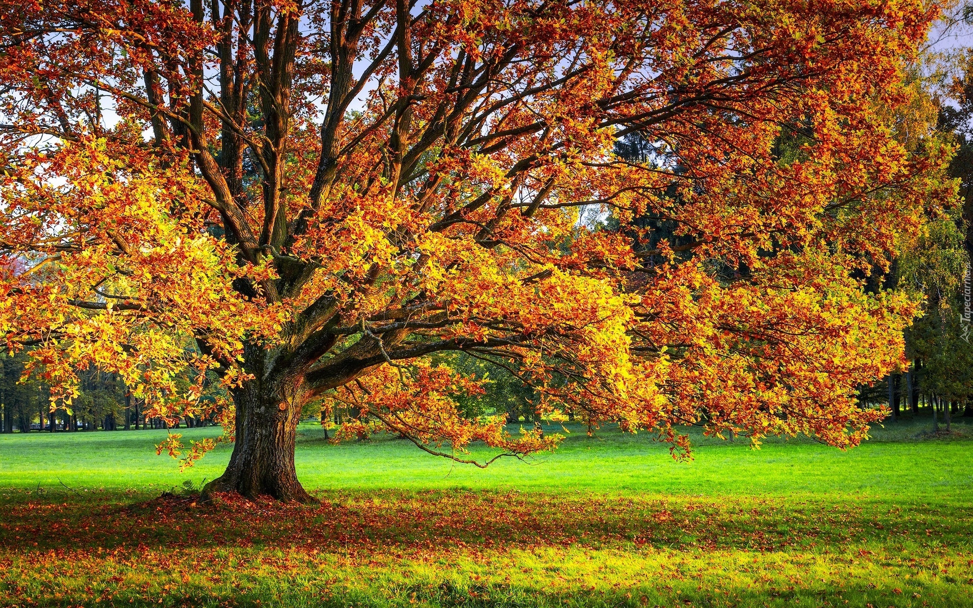 Edytor tapety: Rozłożyste jesienne drzewo na łące