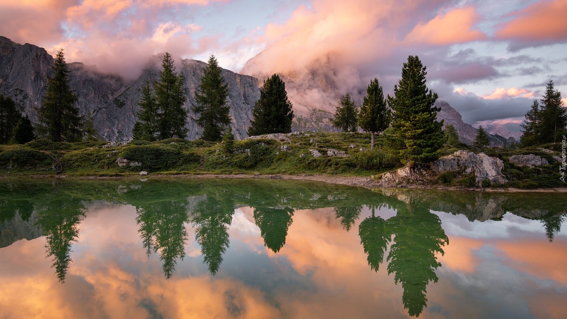 Edytor tapety: Odbicie drzew w jeziorze i chmury nad górami
