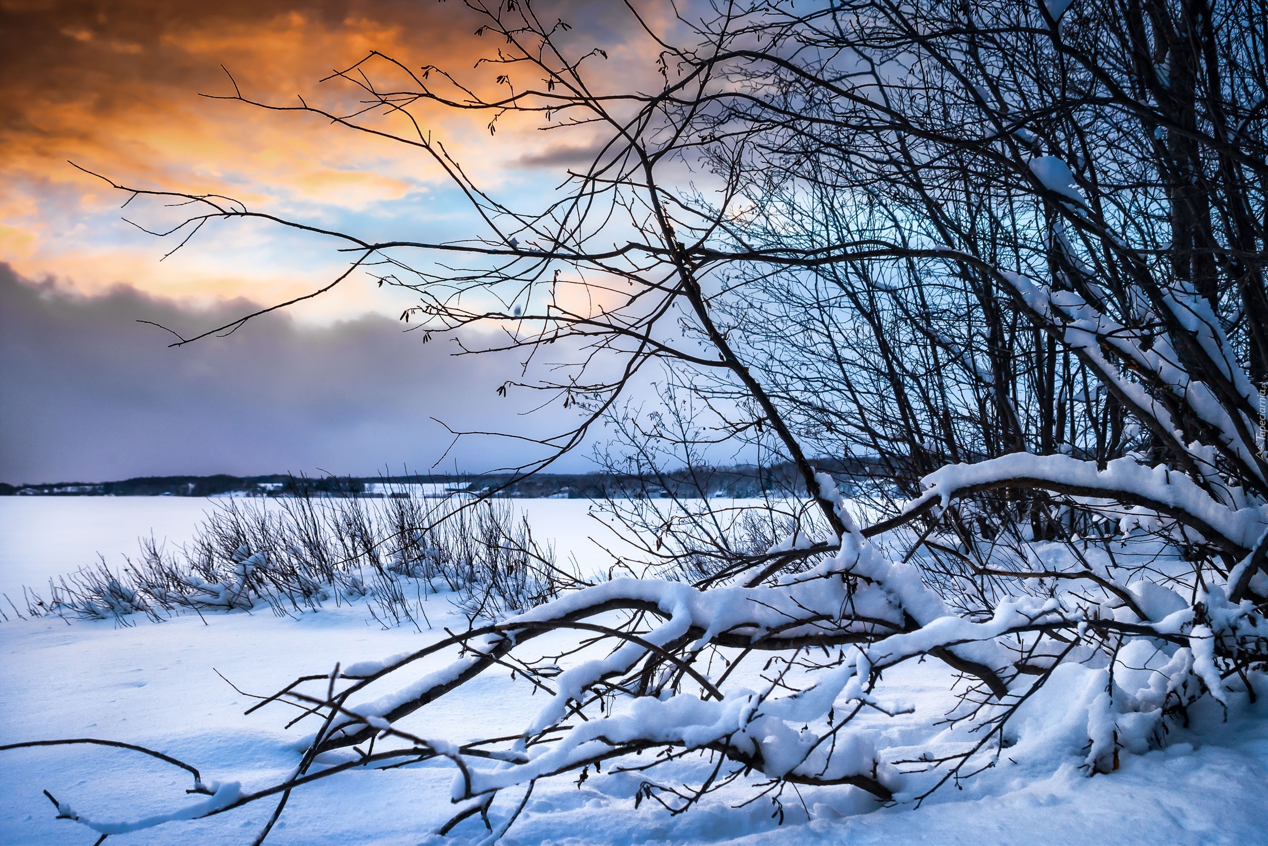 Edytor tapety: Ośnieżone drzewa na polu zasypanym śniegiem