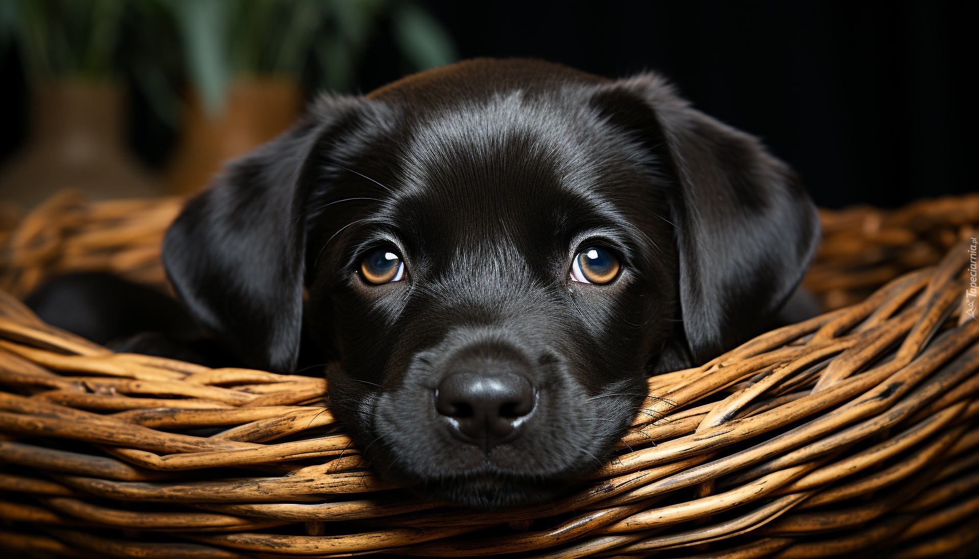 Edytor tapety: Mały czarny piesek w koszyku wiklinowym