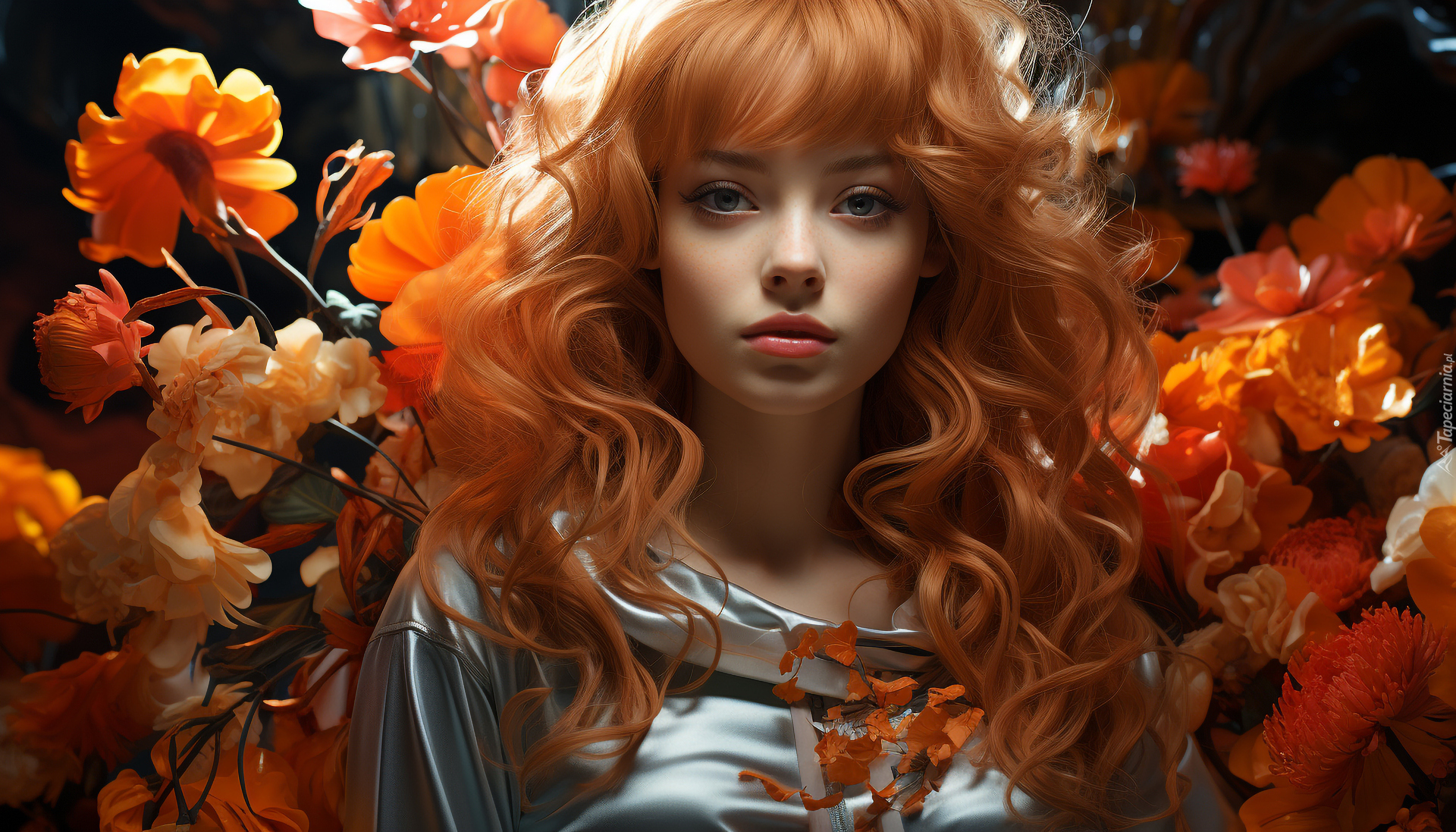 Edytor tapety: Rudowłosa dziewczyna wśród pomarańczowych kwiatów