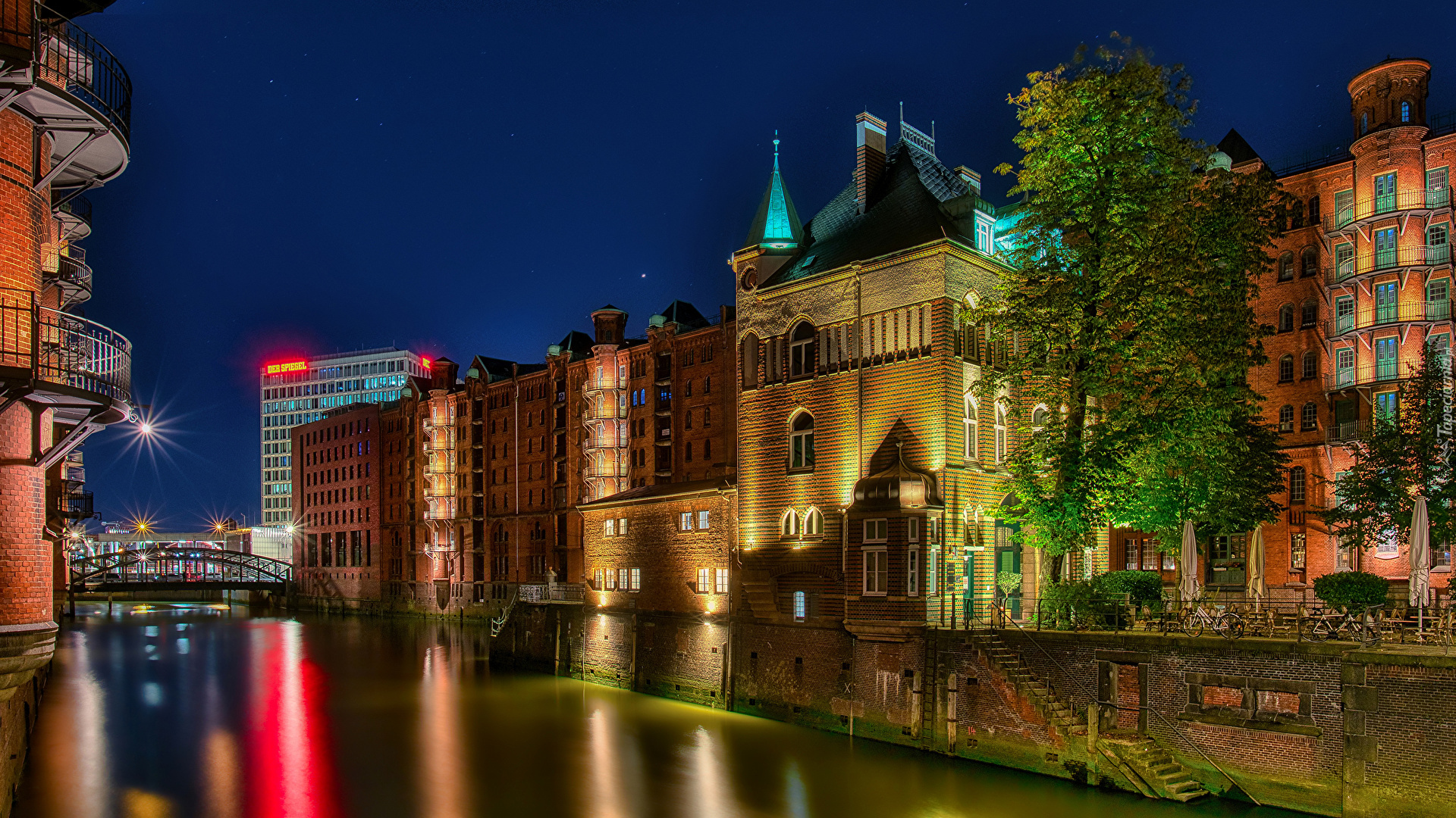 Edytor tapety: Oświetlone nocą domy nad kanałem w Hamburgu