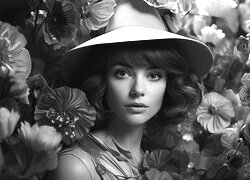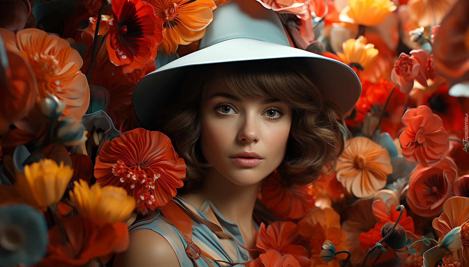 Edytor tapety: Kobieta w kapeluszu wśród kwiatów