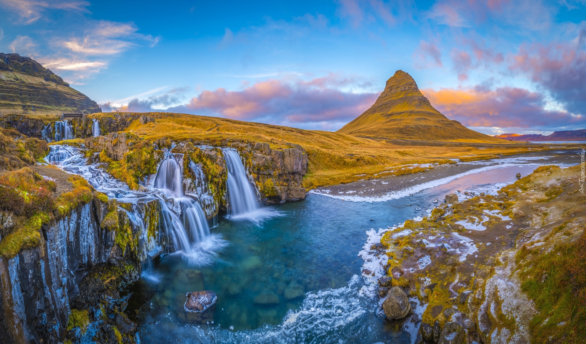 Edytor tapety: Wodospad Kirkjufellsfoss w okolicy góry Kirkjufell w Islandii