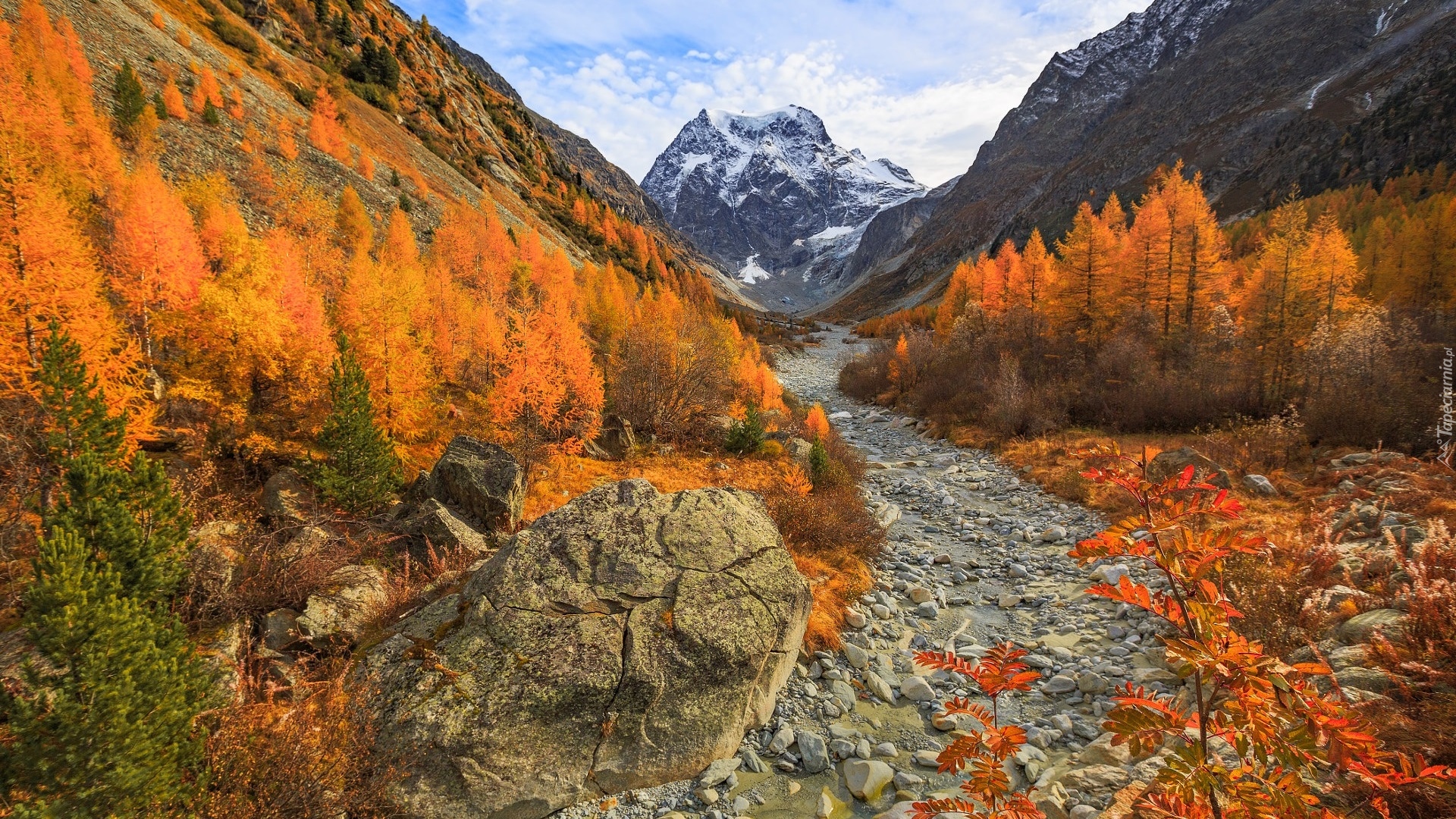 Edytor tapety: Widok na pożółkłe drzewa i górę Mont Collon