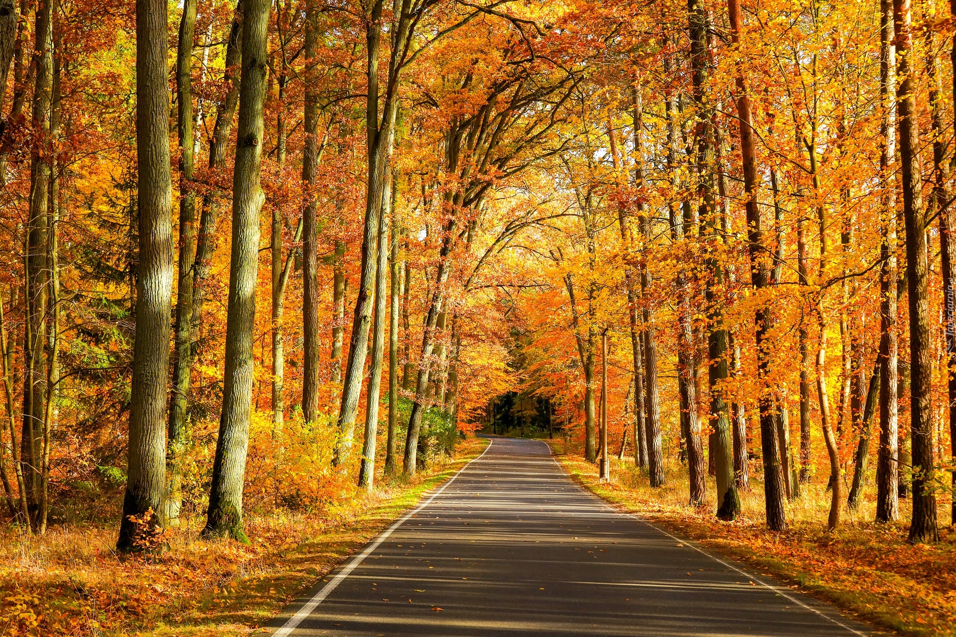 Edytor tapety: Rozświetlone pożółkłe drzewa na poboczach drogi