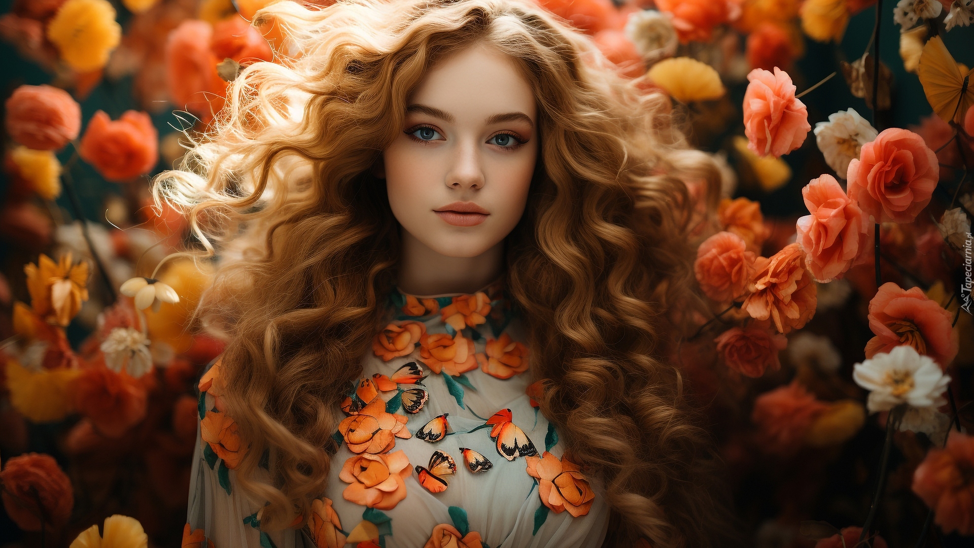 Edytor tapety: Kobieta z kręconymi włosami na tle kwiatów