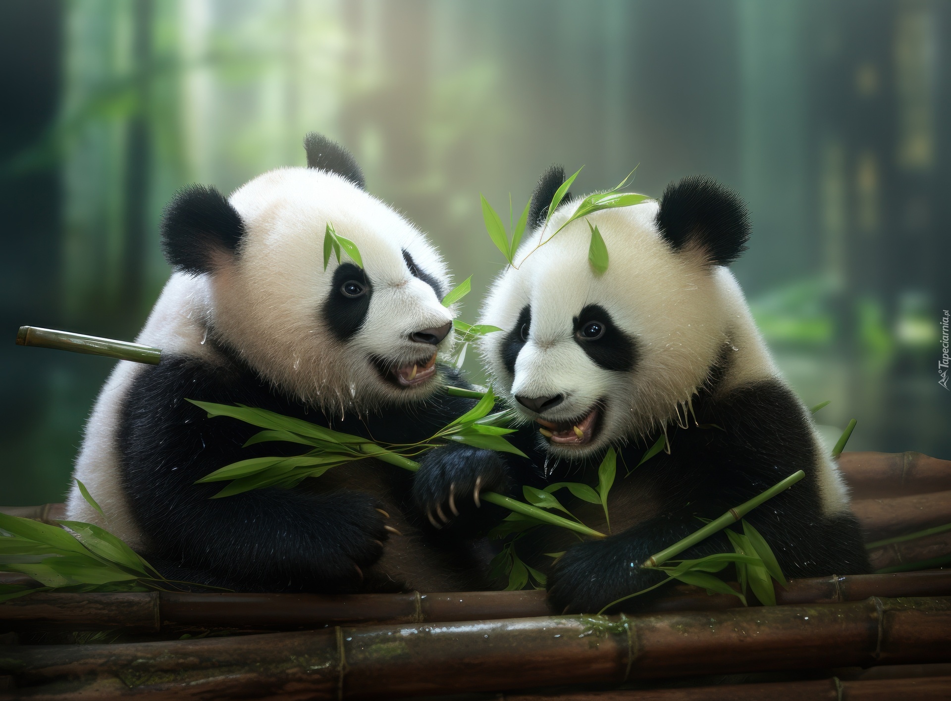 Edytor tapety: Dwie pandy jedzące liście bambusa