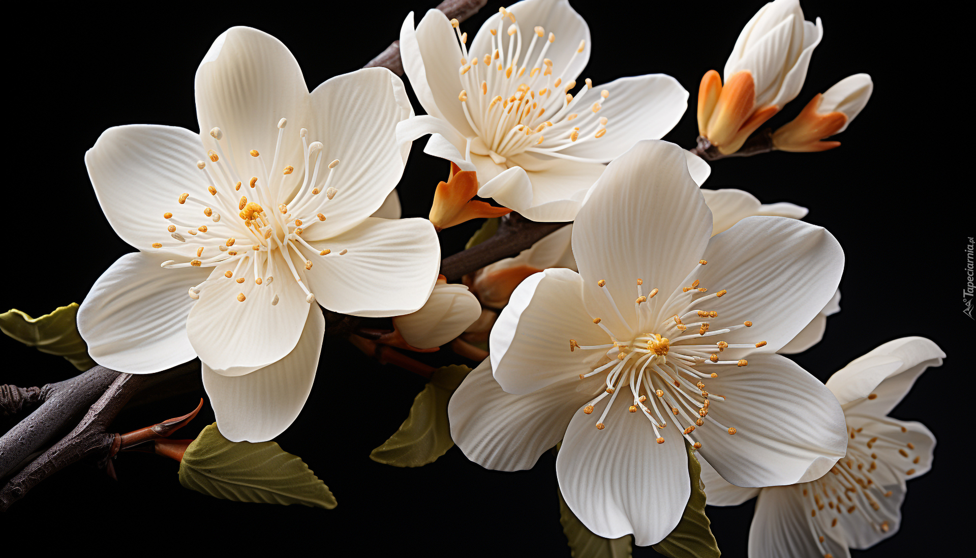 Edytor tapety: Białe kwiaty z pąkami na czarnym tle