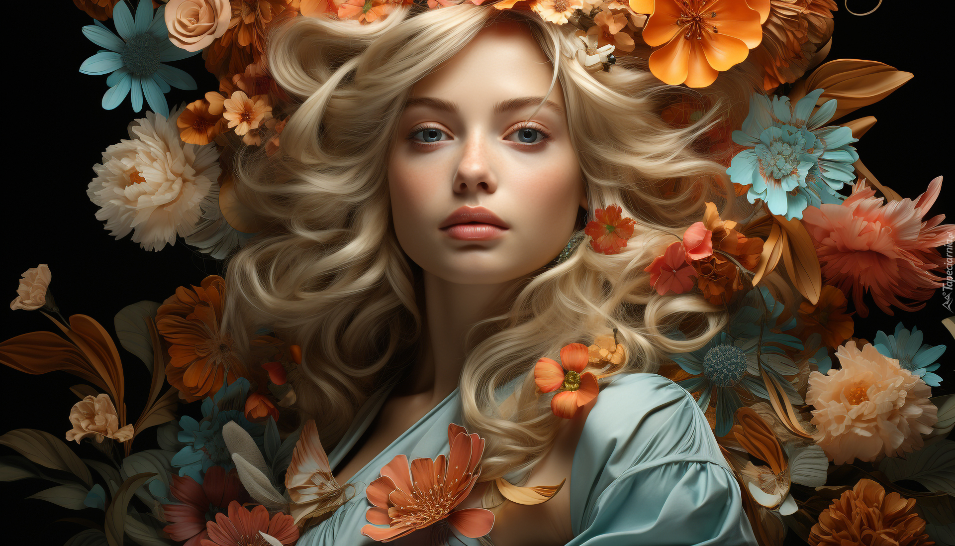 Edytor tapety: Długowłosa blondynka otoczona kolorowymi kwiatami