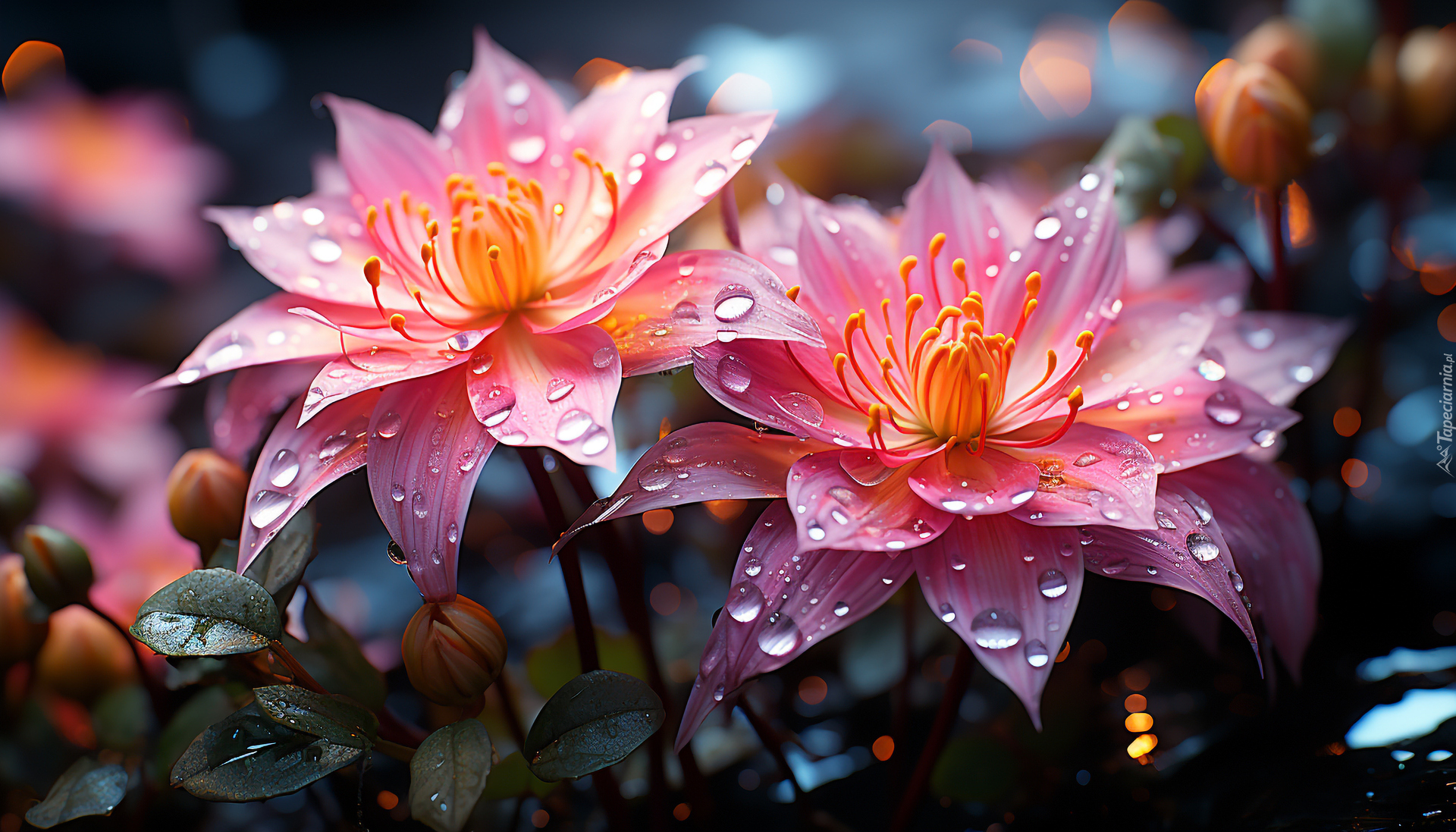 Edytor tapety: Krople wody na rozkwitniętych różowych kwiatach w grafice
