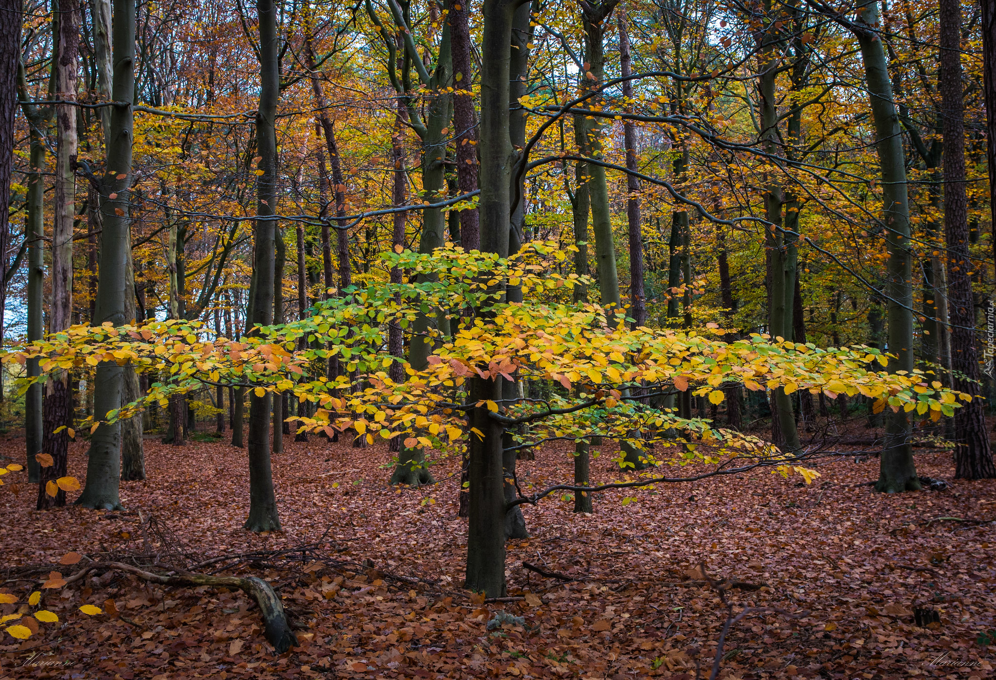 Edytor tapety: Opadłe liście pod drzewami w lesie jesienią