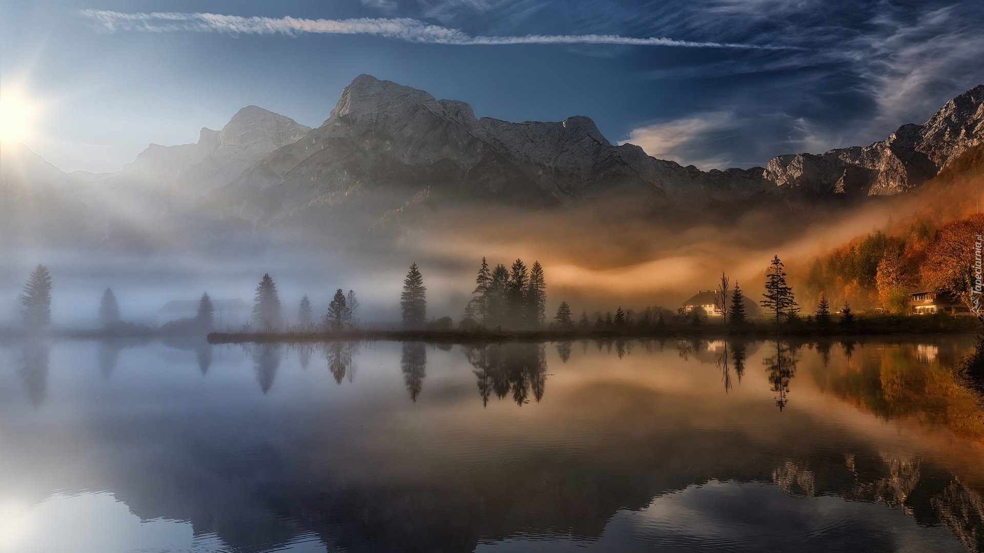 Edytor tapety: Odbicie porannej mgły i gór w jeziorze Almsee
