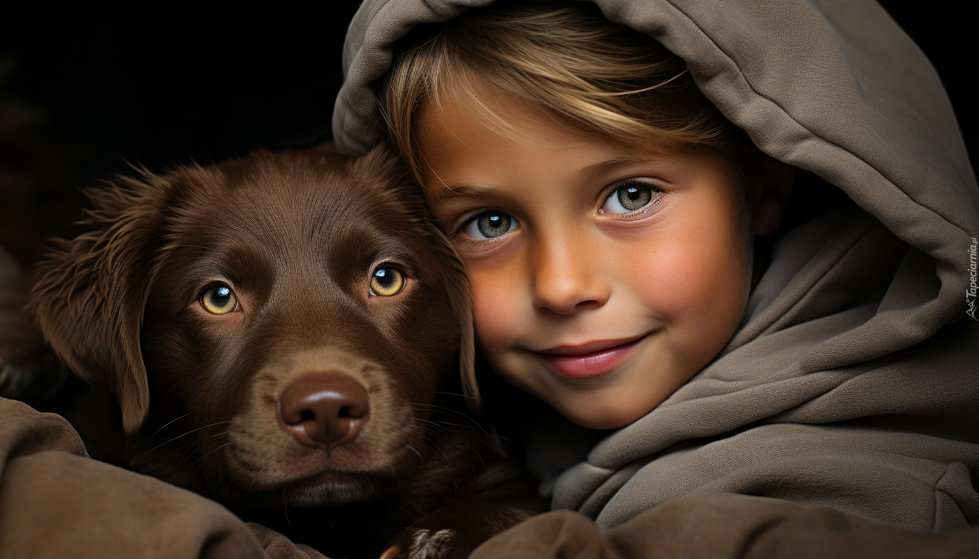 Edytor tapety: Uśmiechnięta dziewczynka w kapturze przytulona do psa