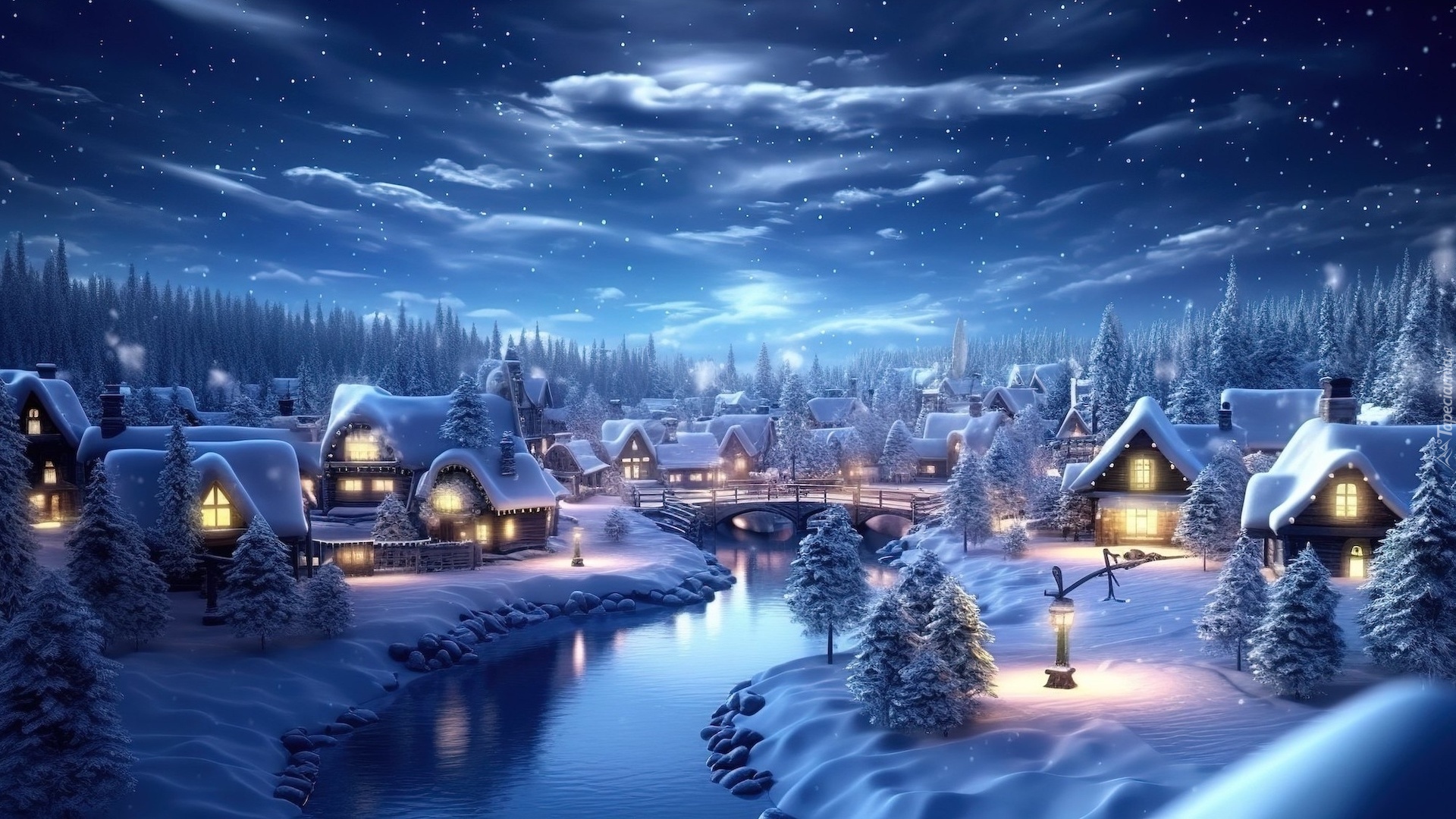 Edytor tapety: Ośnieżone domy nad rzeką w grafice