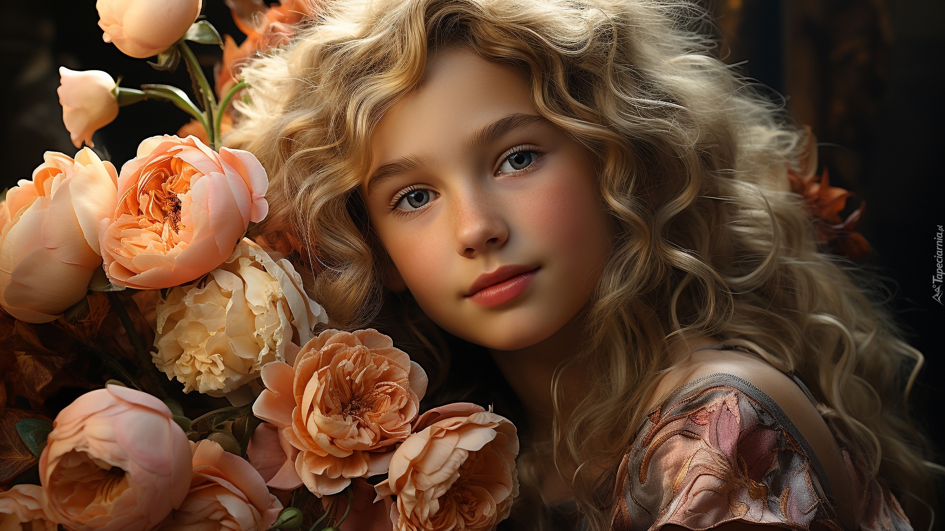 Edytor tapety: Portret dziewczynki wśród kwiatów na czarnym tle