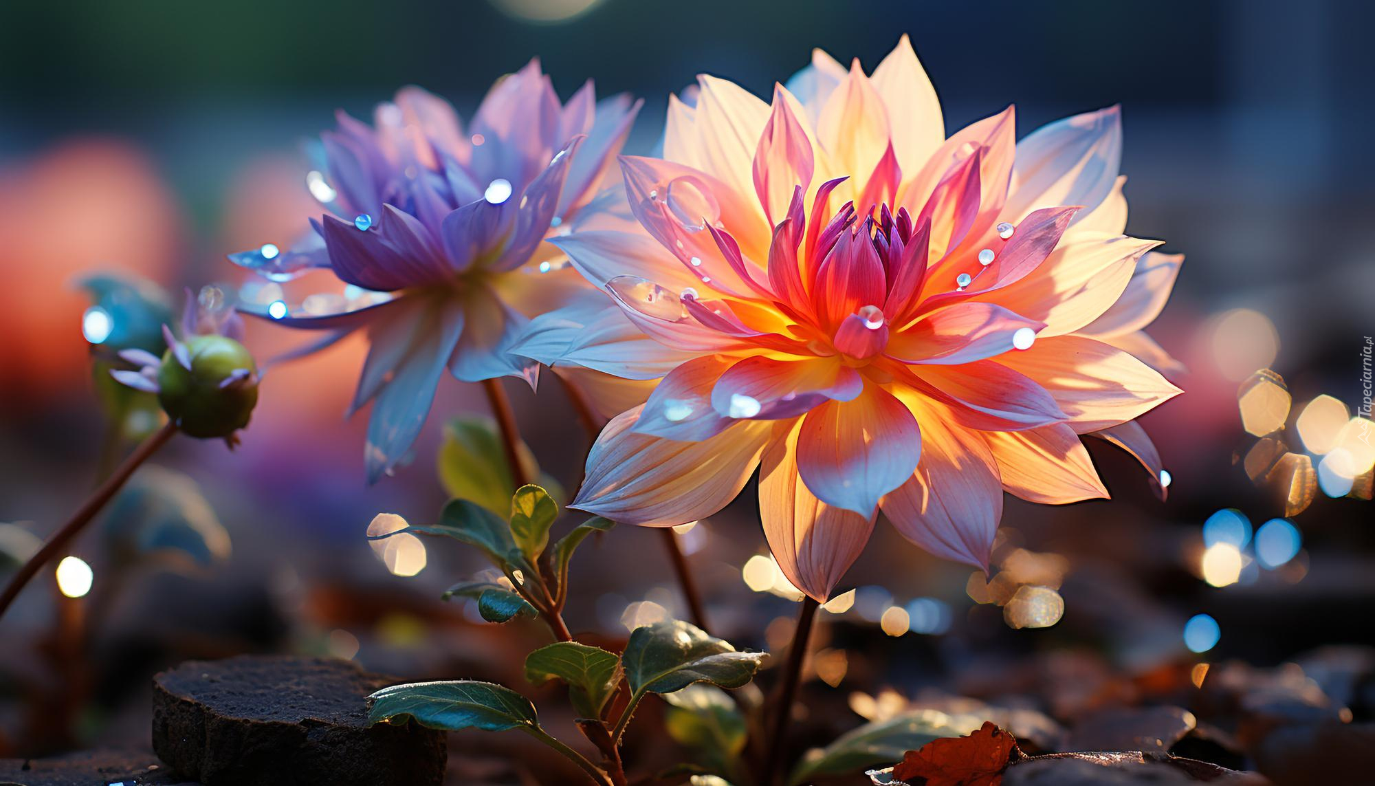 Edytor tapety: Kropelki wody na rozświetlonych kwiatach