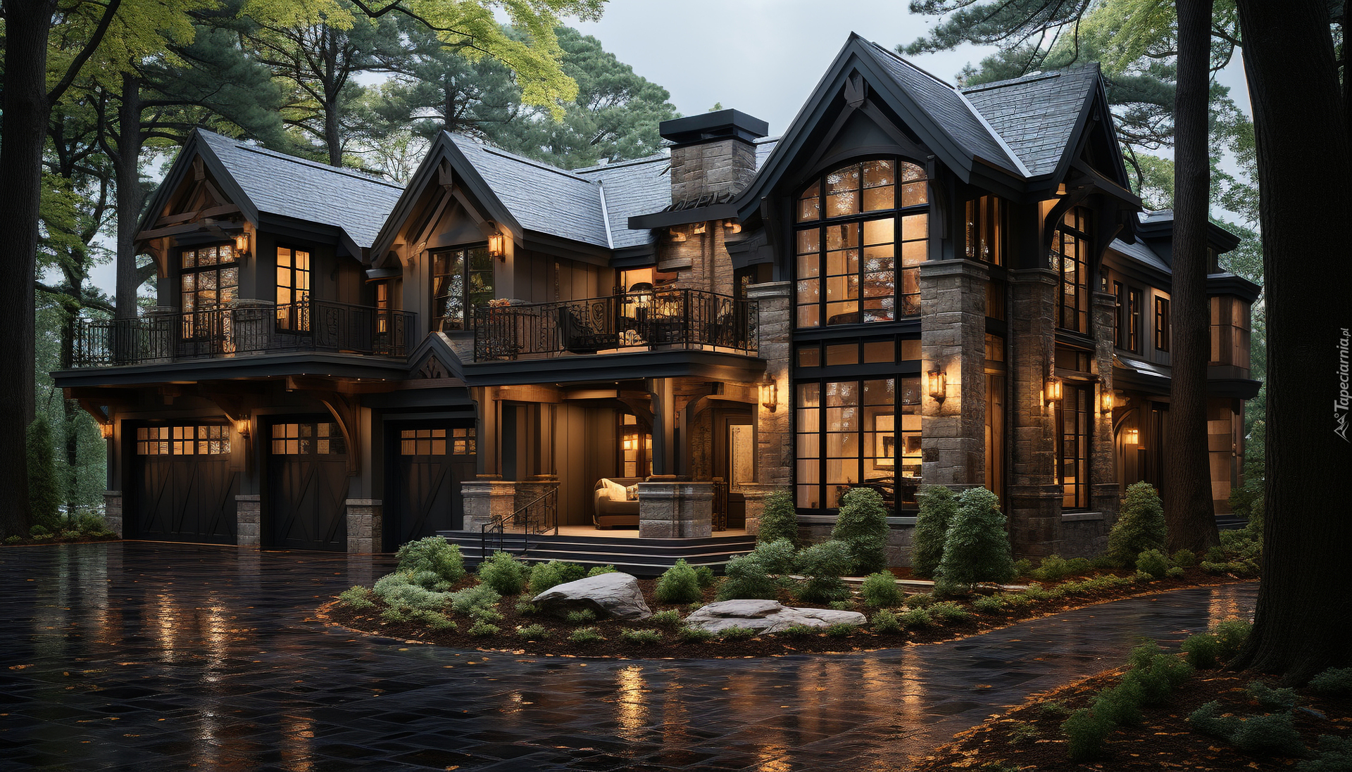 Edytor tapety: Rozświetlone okna w willi pod drzewami