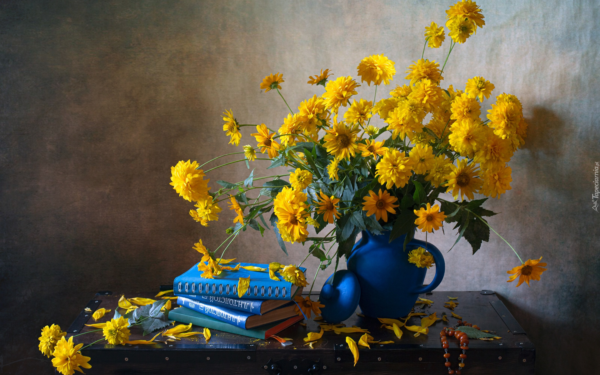 Edytor tapety: Żółte kwiaty w niebieskim dzbanku obok książek