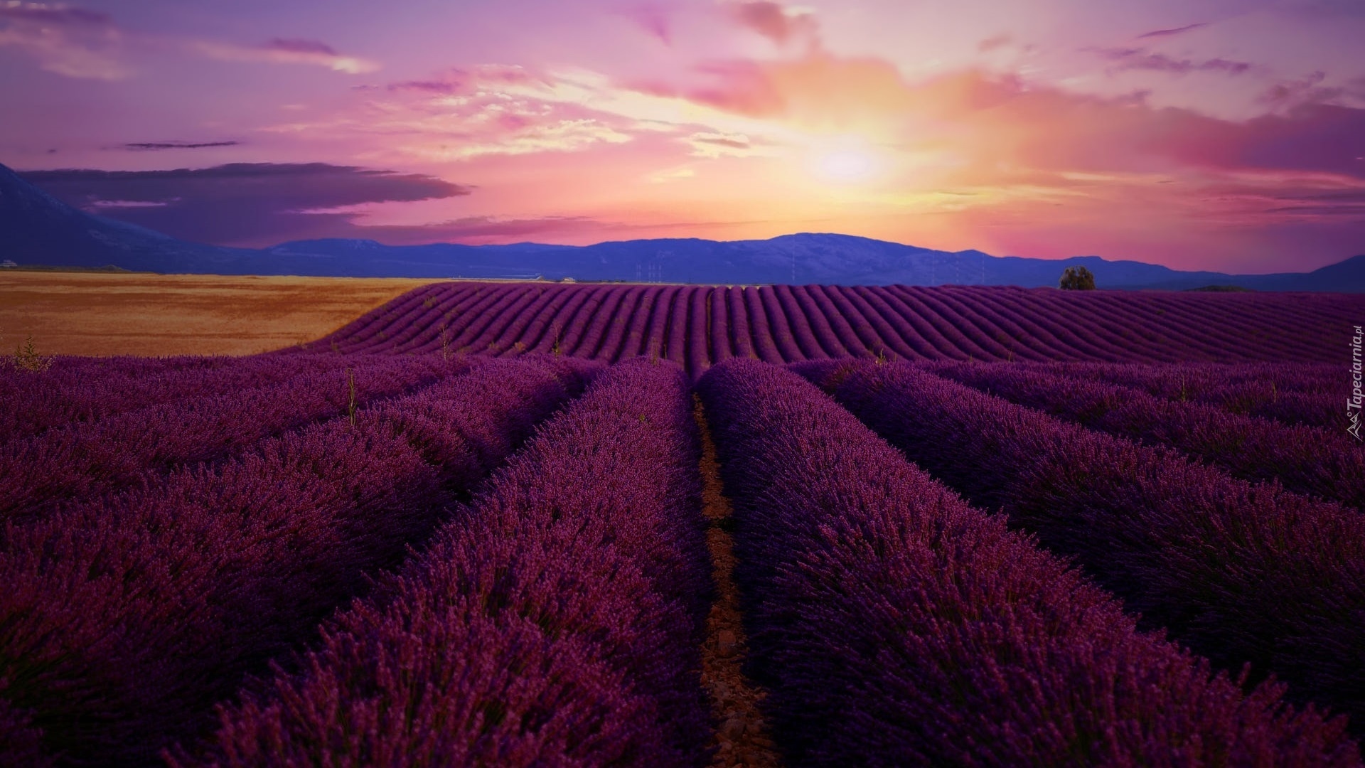 Edytor tapety: Lawendowe pola pod kolorowym niebem zachodzącego słońca