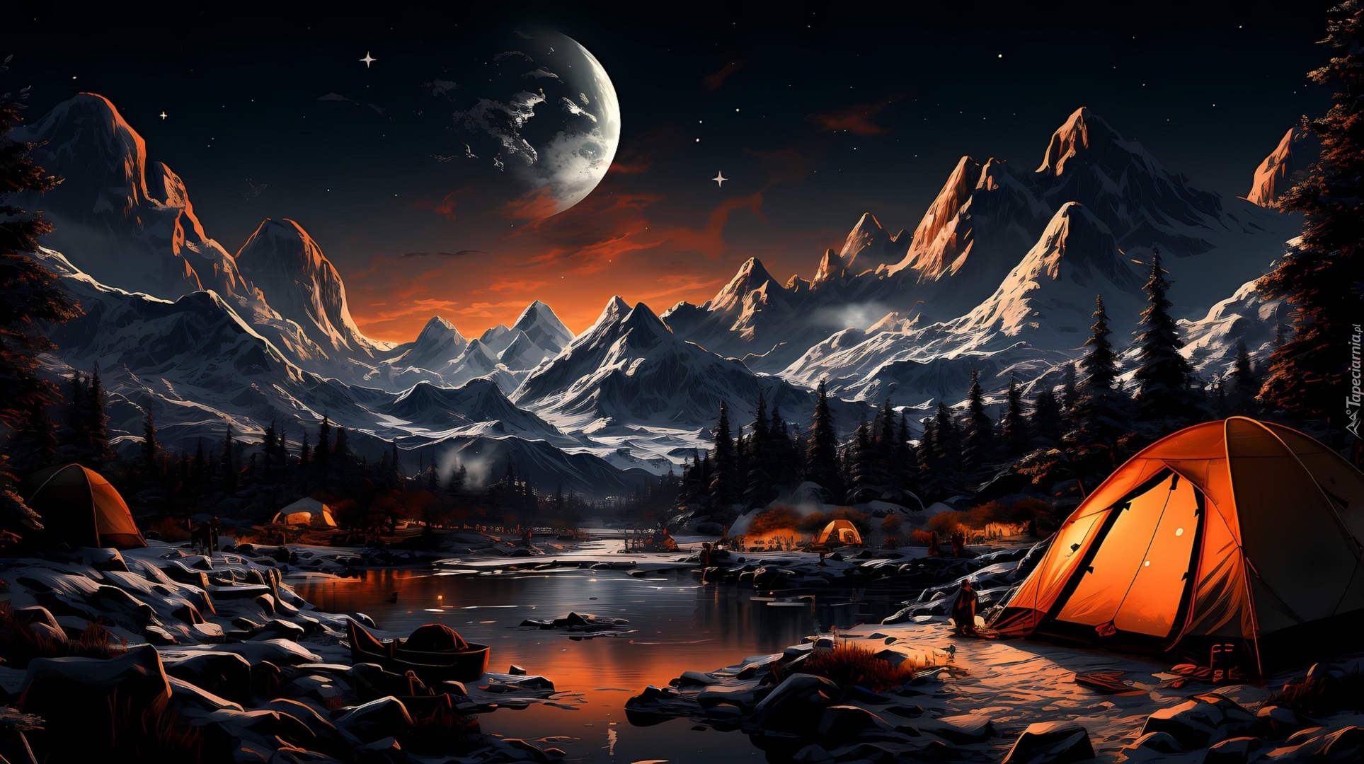 Edytor tapety: Namioty nad rzeką i ośnieżone góry nocną porą