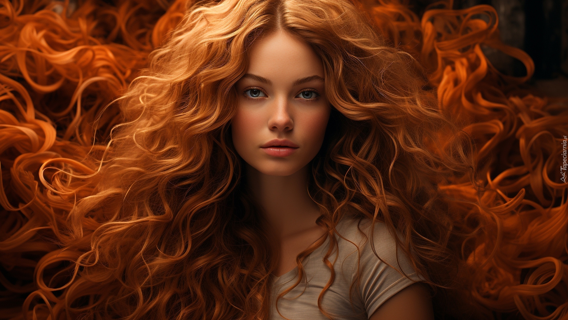 Edytor tapety: Rudowłosa kobieta z długimi kręconymi włosami
