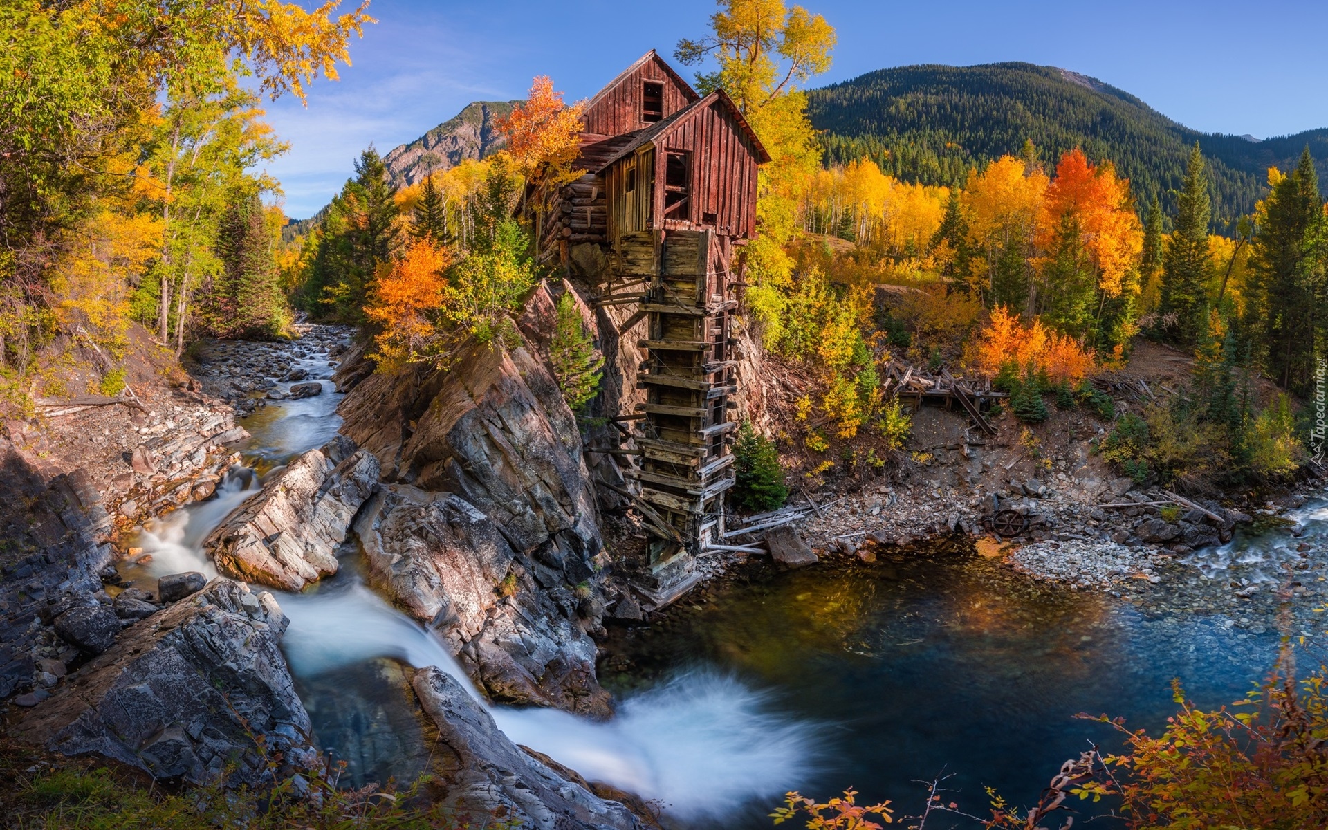 Edytor tapety: Drewniany młyn Crystal Mill na skale w Kolorado