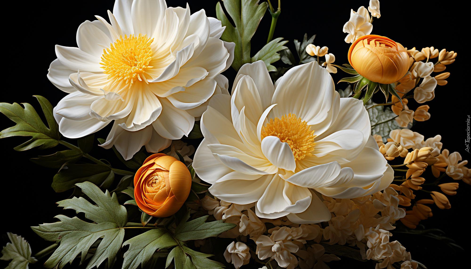 Edytor tapety: Białe rozkwitnięte kwiaty i pomarańczowe pąki obok liści