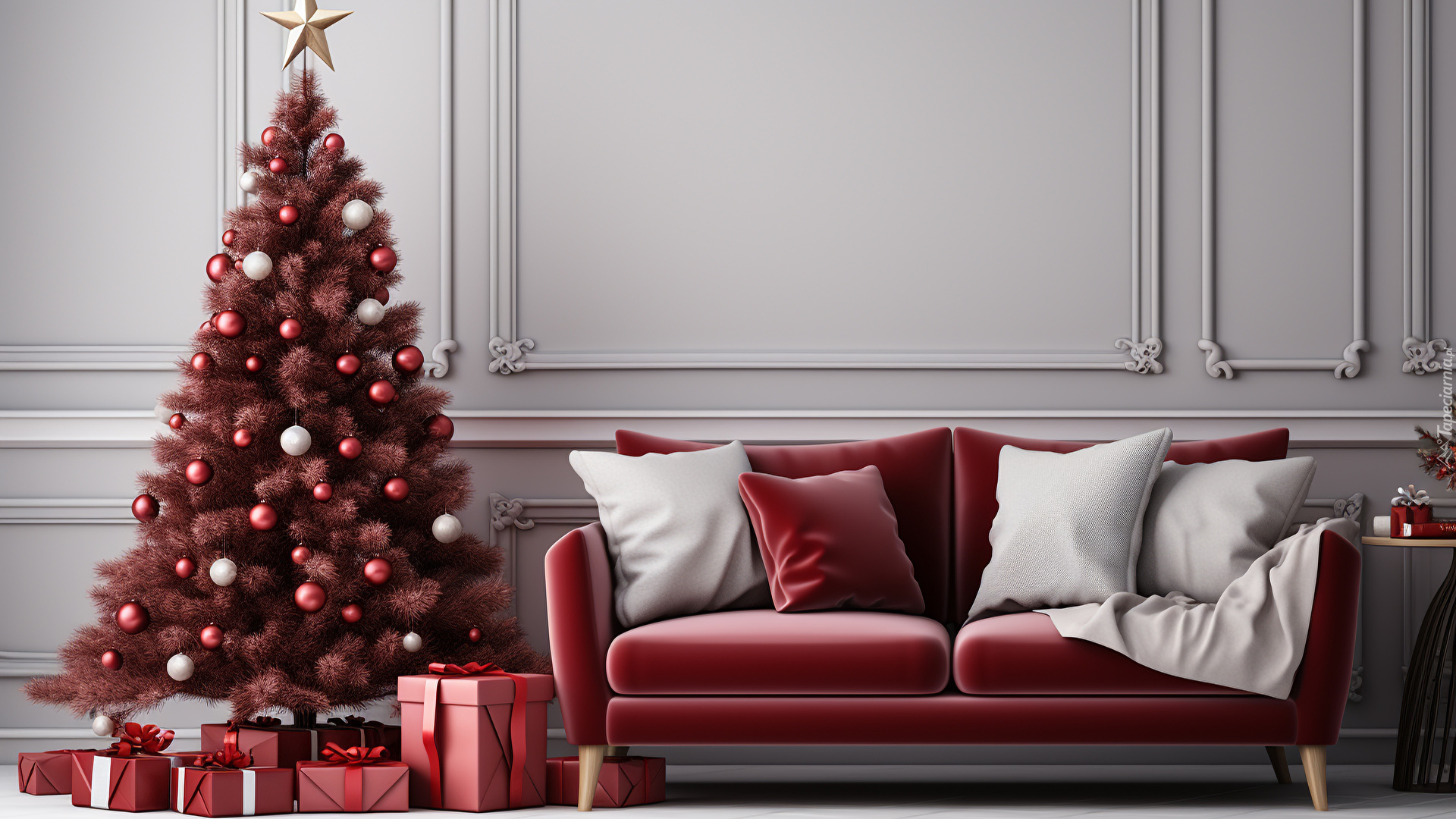Edytor tapety: Prezenty pod choinką obok kanapy w salonie