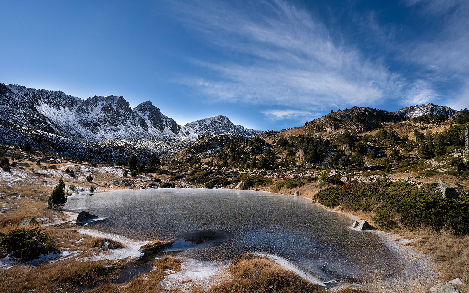 Edytor tapety: Górskie jezioro pod błękitnym niebem