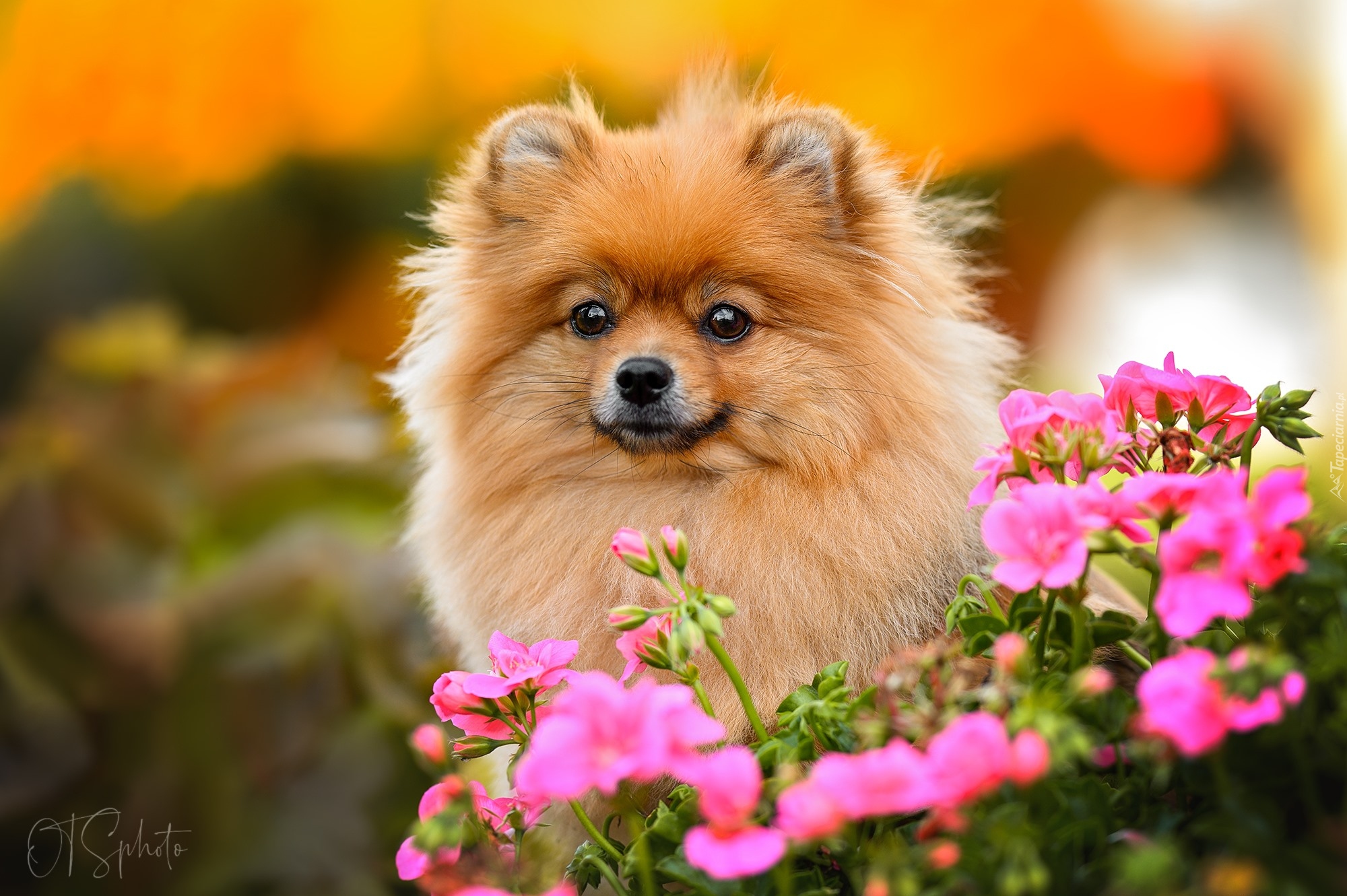 Edytor tapety: Szpic miniaturowy w różowych kwiatach