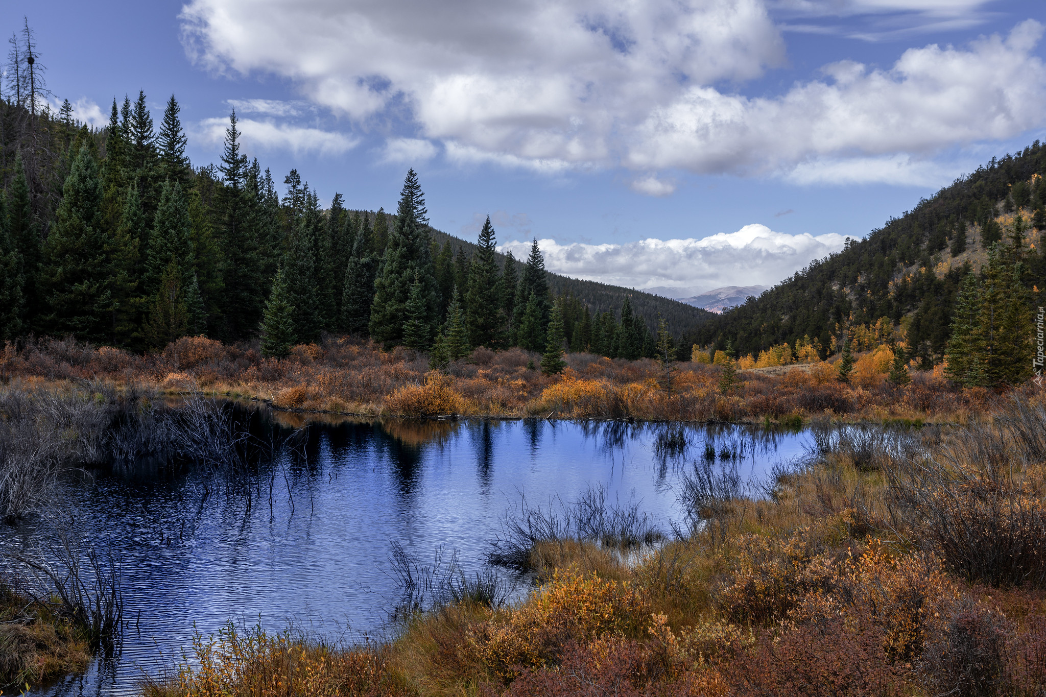 Edytor tapety: Pożółkła trawa nad stawem w zalesionych górach
