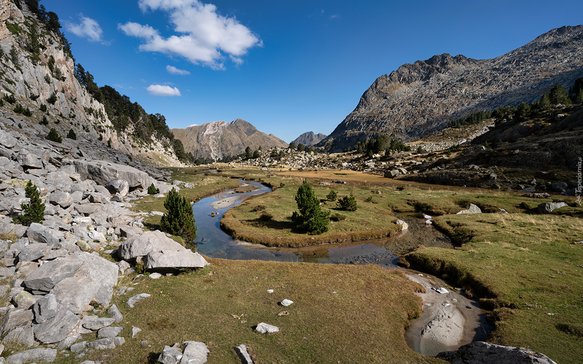 Edytor tapety: Kręta rzeka i głazy w górskiej dolinie