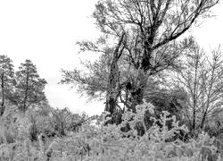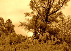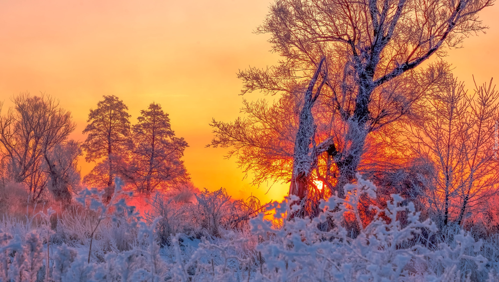 Edytor tapety: Wschód słońca nad oszronionymi drzewami i krzewami