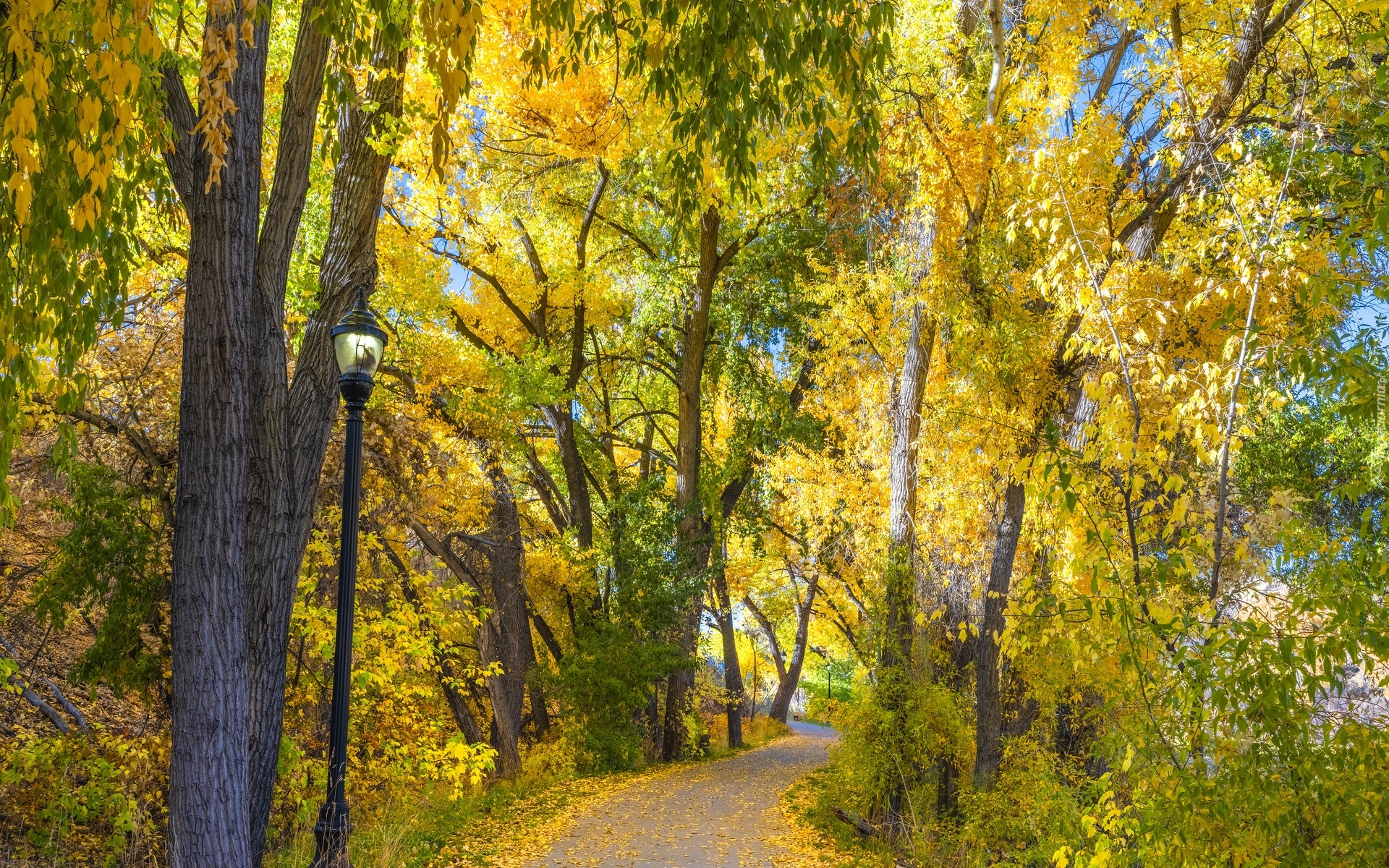 Edytor tapety: Latania pod rozświetlonymi pożółkłymi drzewami przy drodze