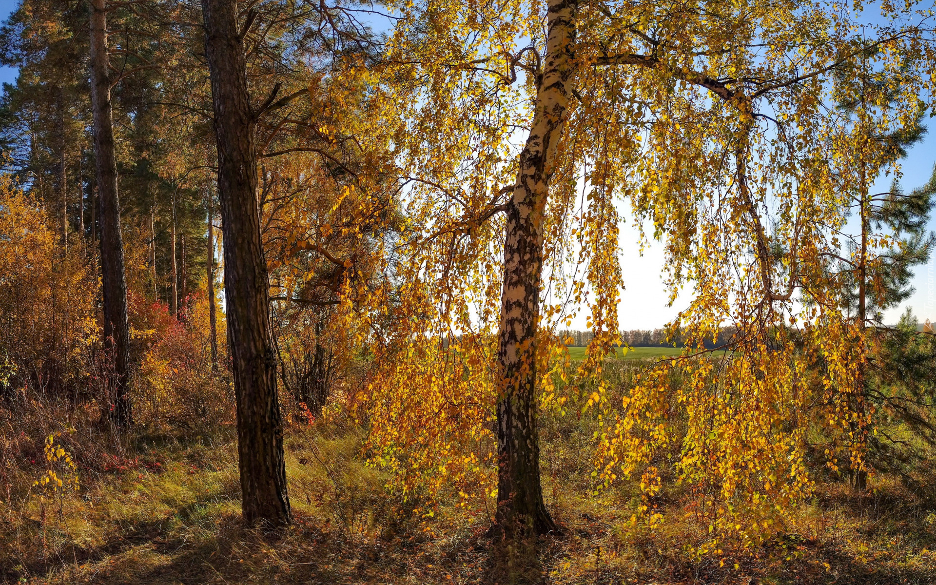 Edytor tapety: Pożółkłe drzewa na skraju lasu jesienią