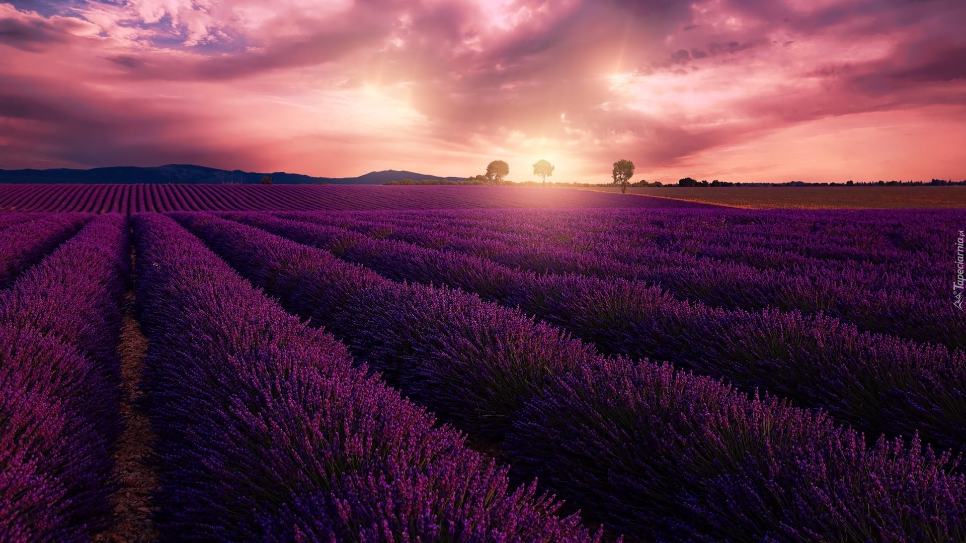 Edytor tapety: Kolorowe niebo nad polem lawendowym