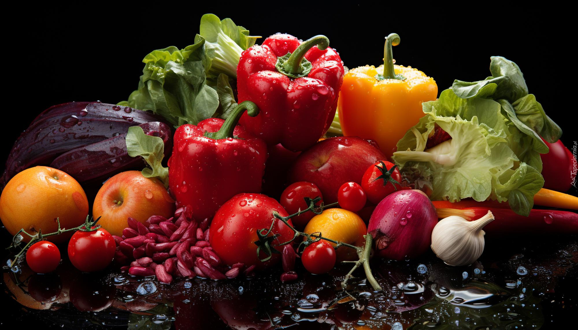 Edytor tapety: Mokre warzywa i jabłka na czarnym tle