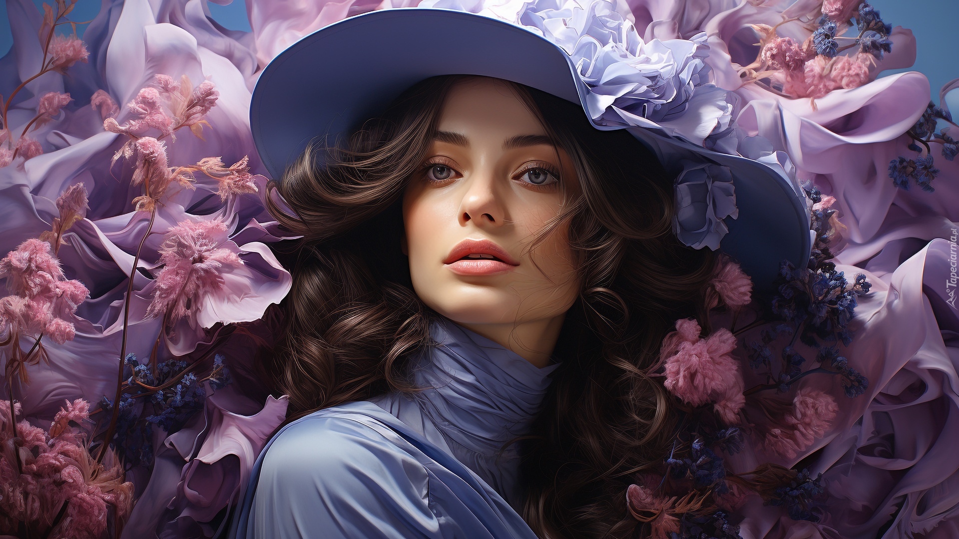 Edytor tapety: Kobieta w niebieskim golfie i kapeluszu wśród kwiatów