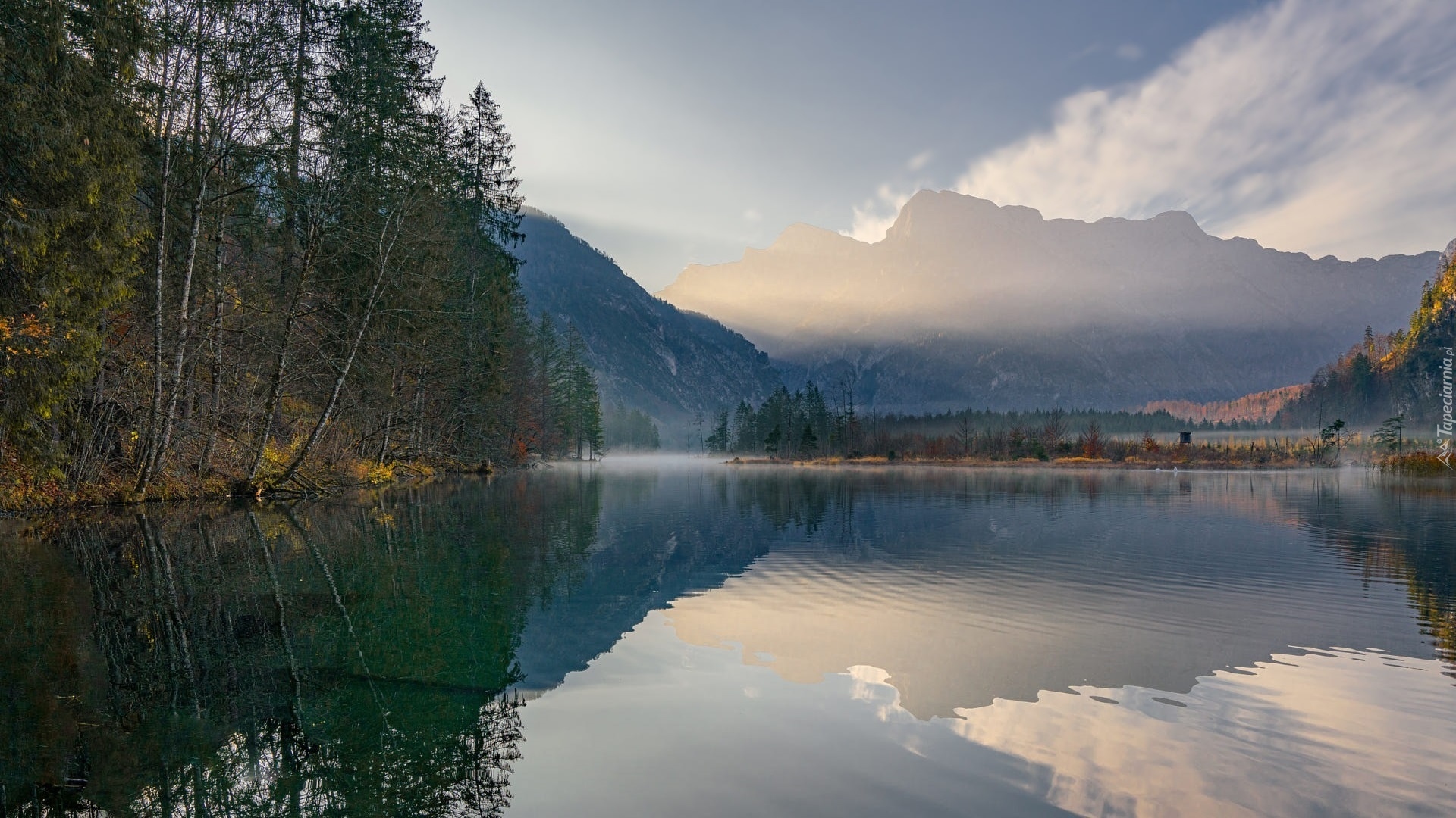 Edytor tapety: Drzewa nad jeziorem Almsee