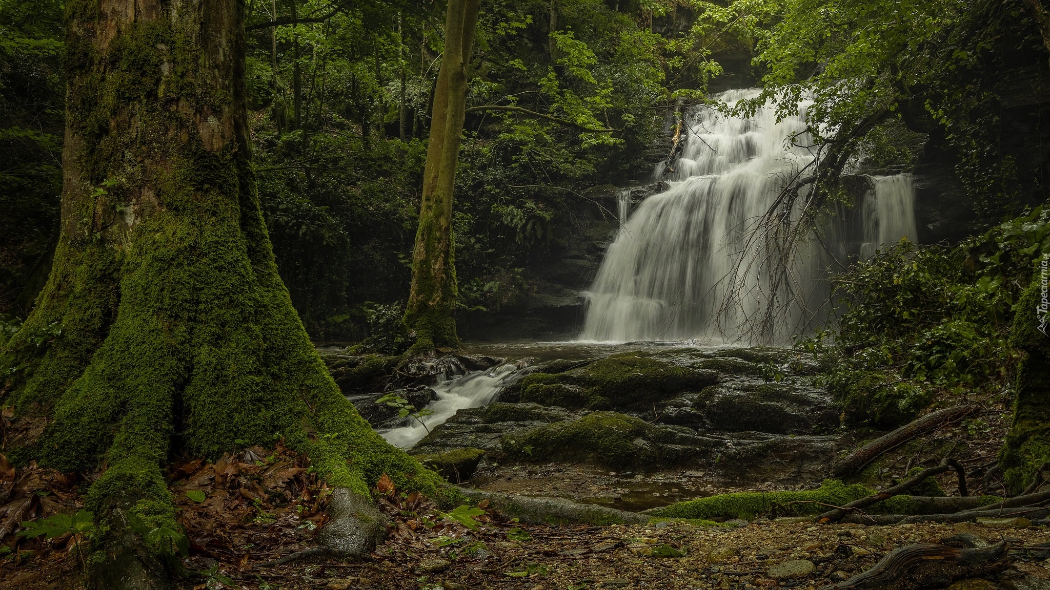 Edytor tapety: Krzewy i omszałe drzewa przy wodospadzie na skałach