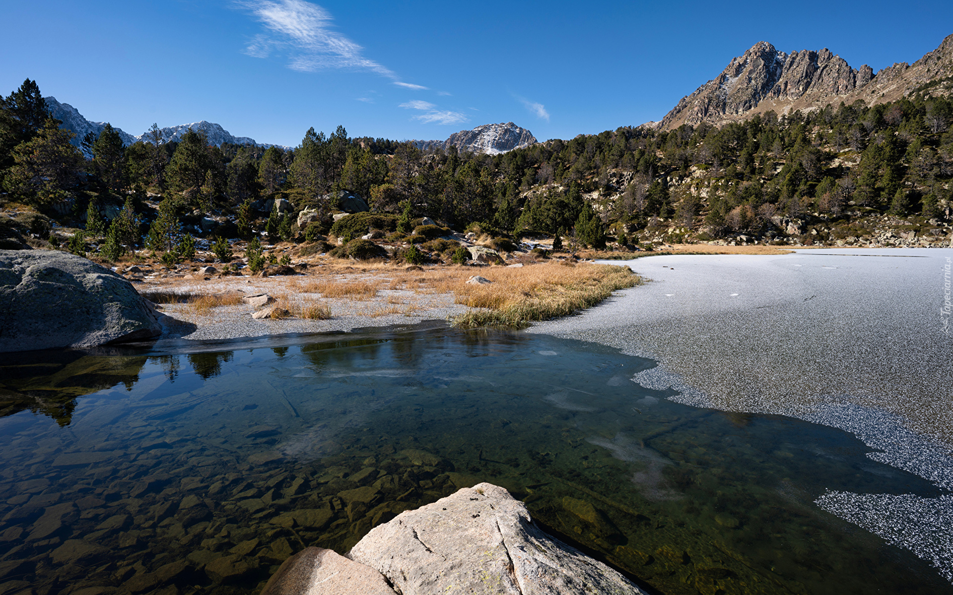 Edytor tapety: Widok znad rzeki na drzewa i góry