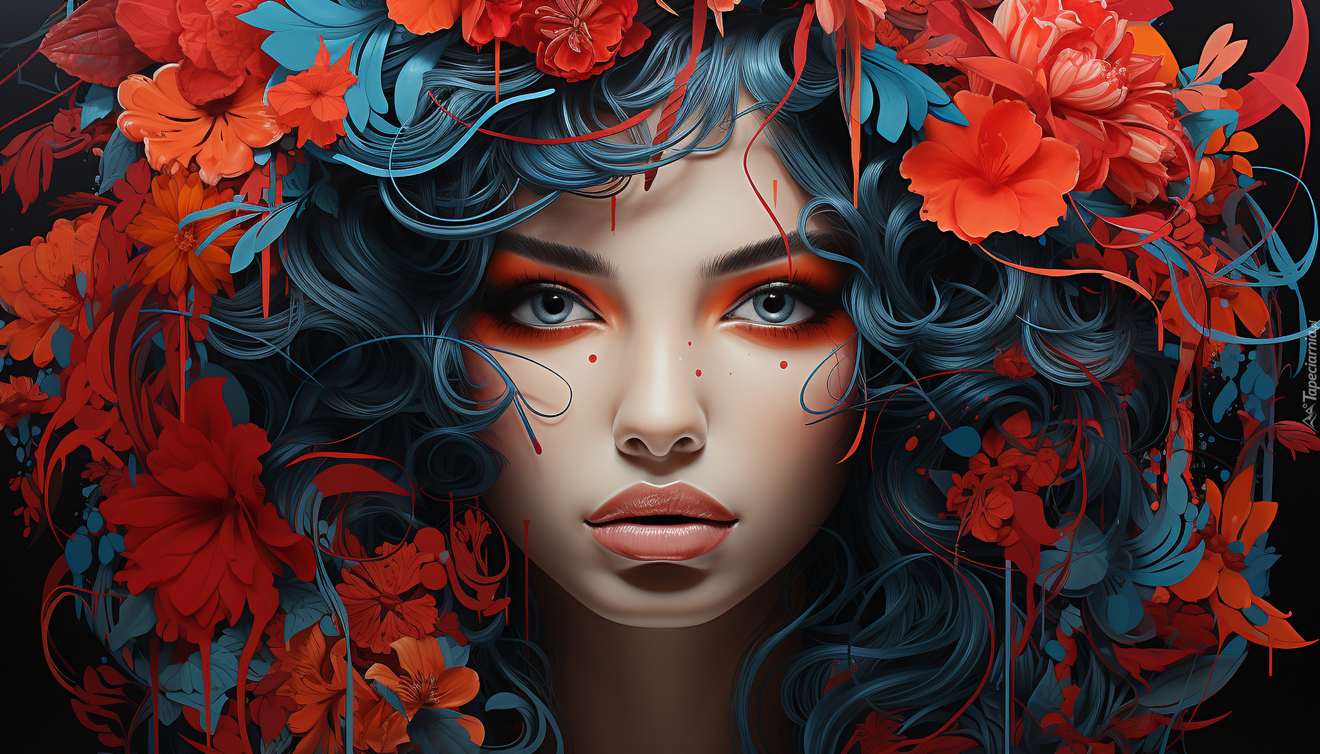 Edytor tapety: Twarz kobiety otulona kwiatami w grafice