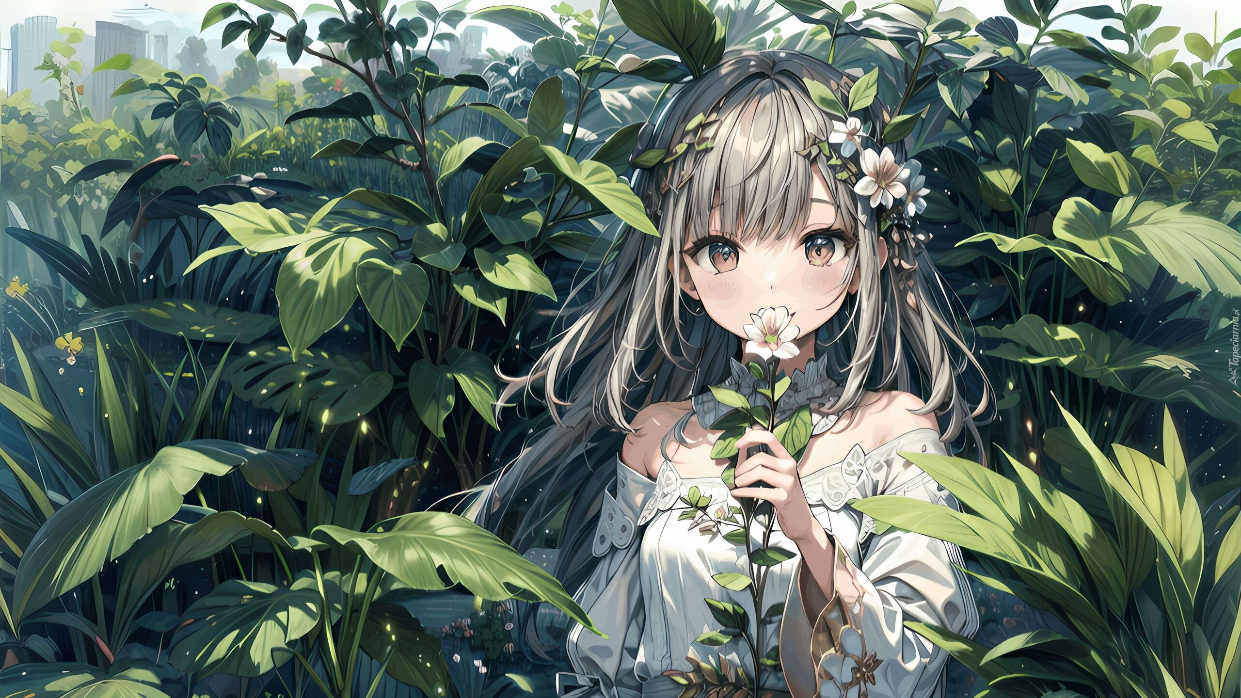 Edytor tapety: Dziewczyna z kwiatkiem w dłoni wśród liści