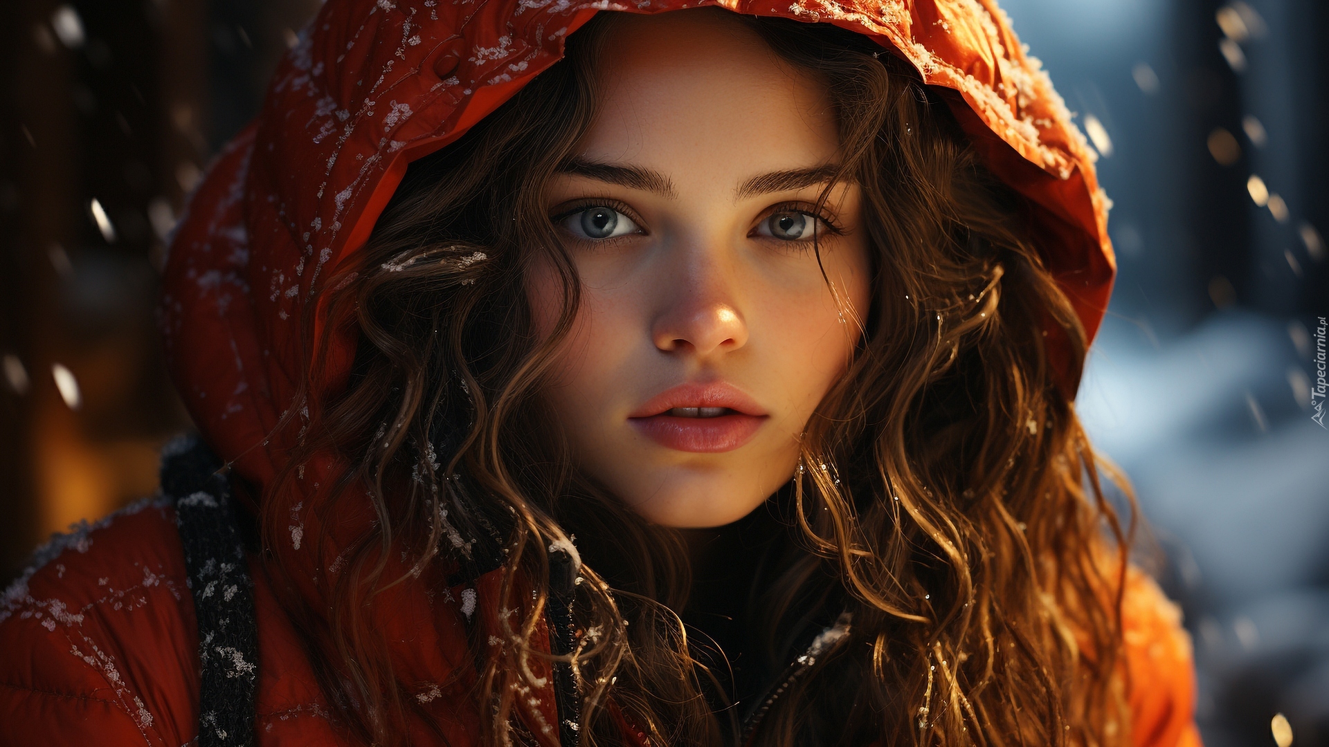 Edytor tapety: Kobieta w kapturze i padający śnieg