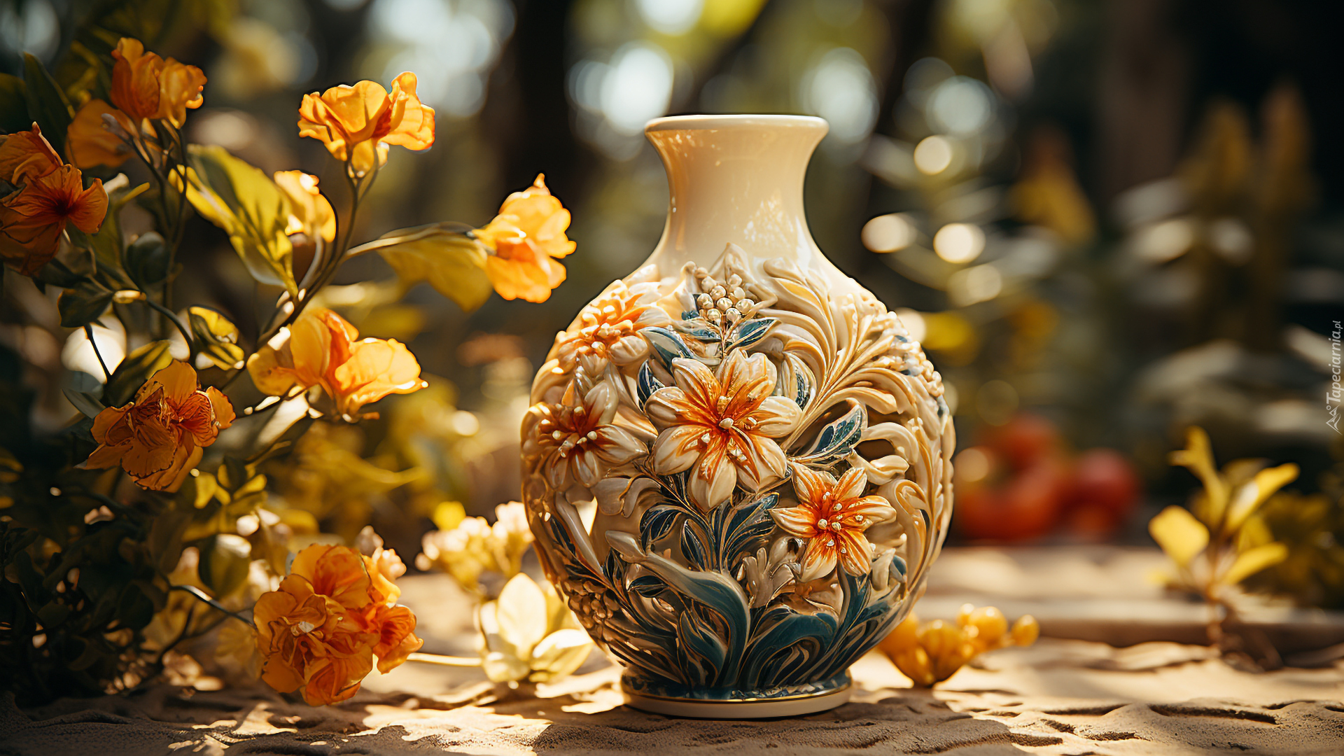 Edytor tapety: Ozdobny ceramiczny wazon obok kwiatów